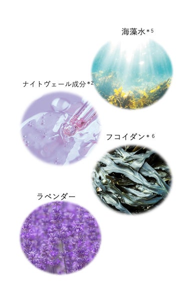 ナイトスチーマー成分*1(深層水*4 ・海藻水*5 ・フコイダン*6)+ナイトヴェール成分*2 (スフィンゴ糖脂質*7・セラミド*8 ・ヒアルロン酸*9 )配合で、睡眠時に起こる髪のパサつきや髪と肌の乾燥をケアします。