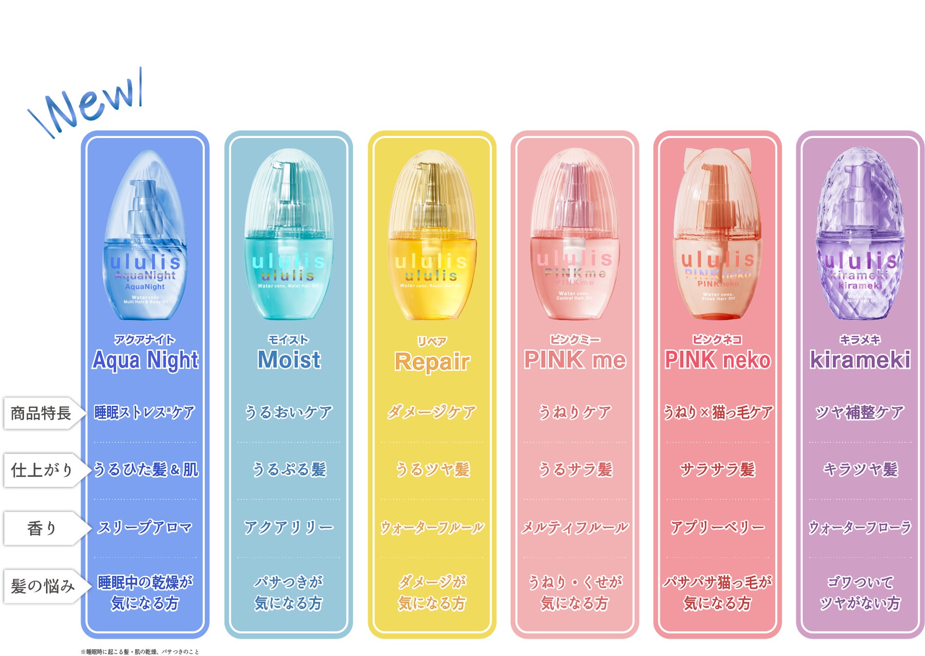 「うるおいのモイスト」、「ダメージケアのリペア」 、「うねりケアのPINKme」 、「ツヤ補整ケアのキラメキ」の4シリーズに加え、今回新たに「うるひた乾燥ケアのAqua Night」が登場。