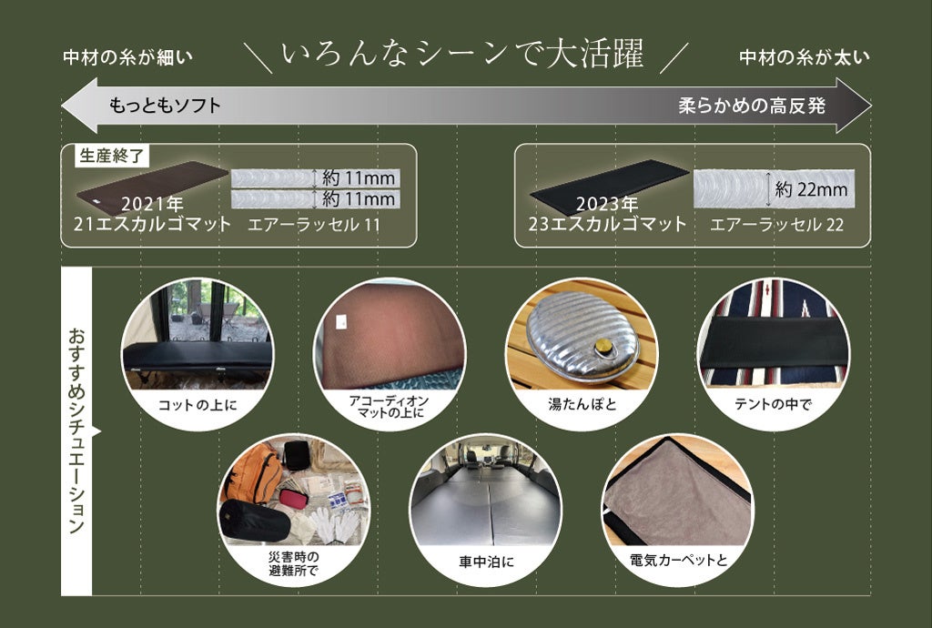 製品リニューアル後は中材に使用される糸の太さの変更、マットのベースカラーをブラックに一新。さらにアウトドアブランド・オレゴニアンキャンパーが監修する持ち運びに便利な収納バッグを付けて販売します。