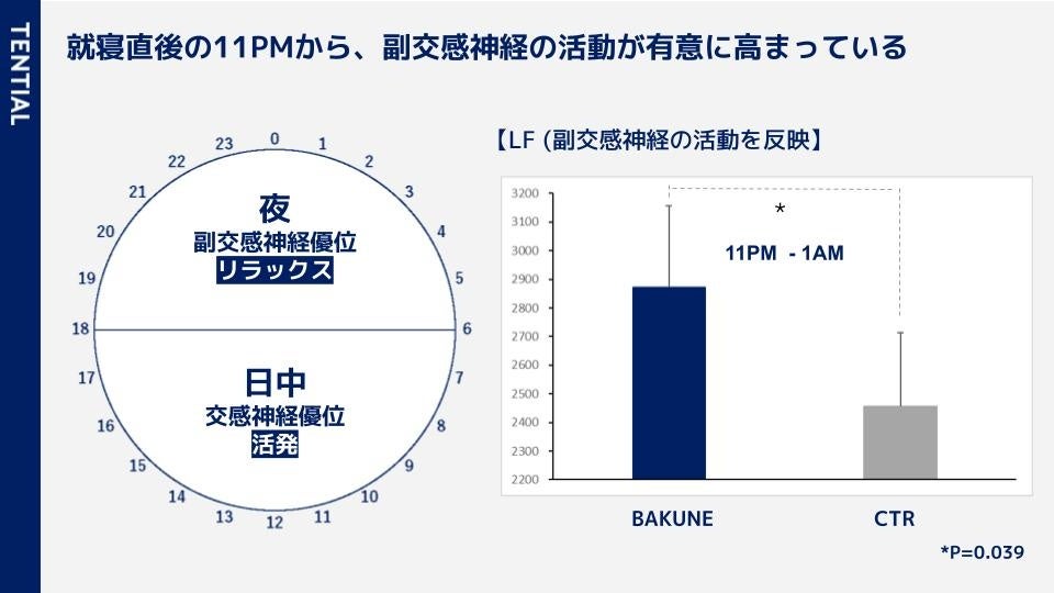 加えて、自律神経においては睡眠後半にストレス指標であるLF/HF値が有意に低値を示しました。以上のことから、睡眠後半まで快適な睡眠を持続できていると考えられます。