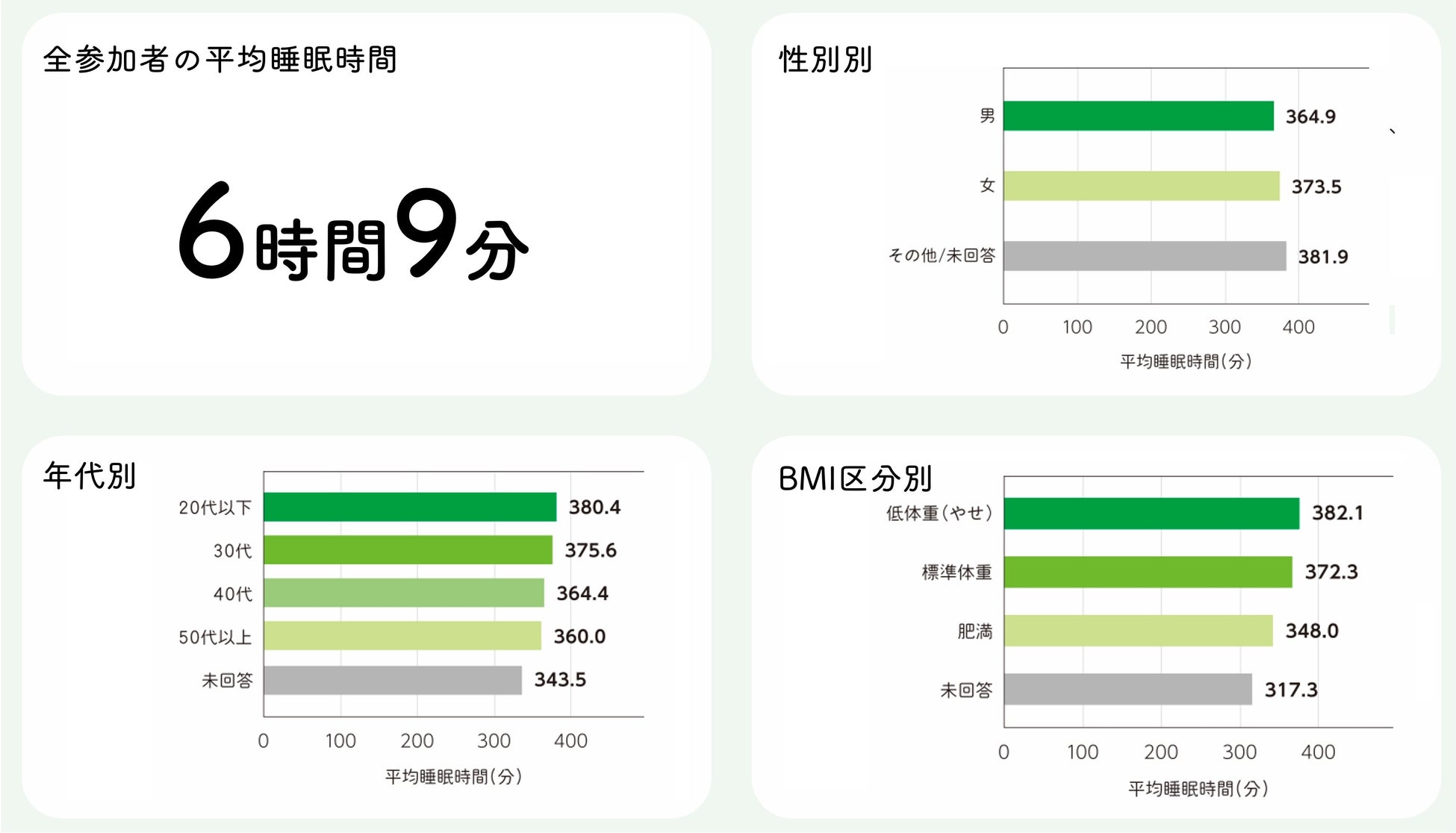 本運動の参加者における平均睡眠時間は6時間9分。経済協力開発機構(OECD)の調査「Gender Data Portal 2021」( https://www.oecd.org/gender/data/ )による日本人の平均睡眠時間(7時間22分/加盟30カ国の中で最下位)をも下回り、ビジネスパーソンの睡眠不足傾向を示す結果に。