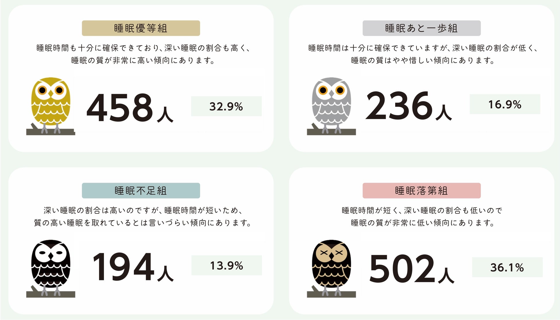 本運動期間中に14日間計測を行った参加者には、計測した睡眠データを基に個人レポート結果がアプリ内で表示されます。このレポートでは「睡眠時間の長さ」と「深い睡眠の割合」を基に睡眠タイプを4つの組に分類。その結果、睡眠時間が短く、深い睡眠の割合も低い“睡眠落第組”が、4つの組の中で最多の36.1%となりました。