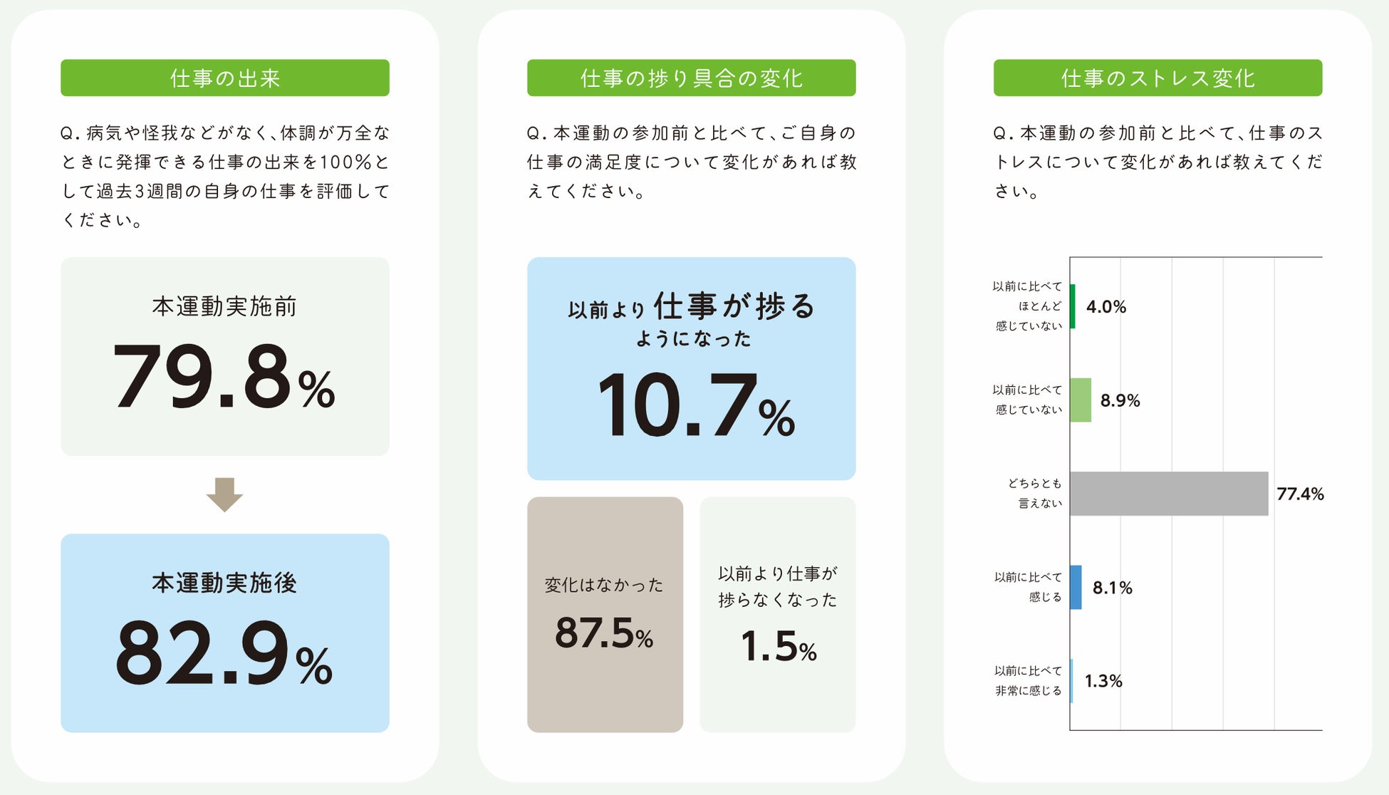 本運動参加前後に実施したアンケート調査では、100%を満点とした「仕事の出来」に関する自己評価が参加前79.8%→参加後82.9%に伸長。また、参加前と比べて「以前より仕事が捗るようになった」が10.7%、仕事のストレスを「ほとんど感じていない」+「感じていない」が12.9%となった。
