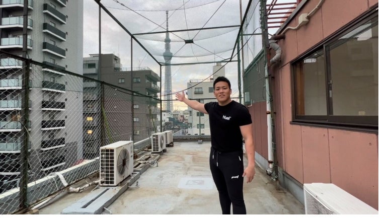 △錦糸町合宿所の屋上の様子。スカイツリーが一望できる。