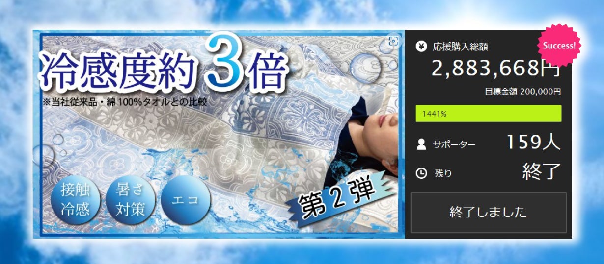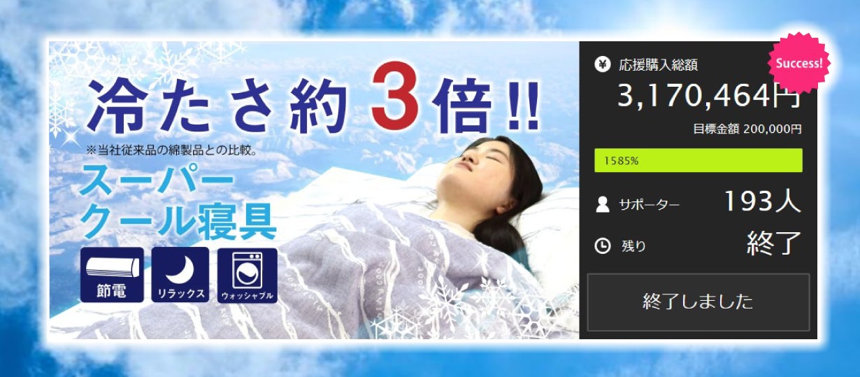 過去に行いましたスーパークールケットは、プロジェクトを2回実施し、開始時から多くの応援購入をいただき、どちらも目標金額の1500%近く売り上げました!