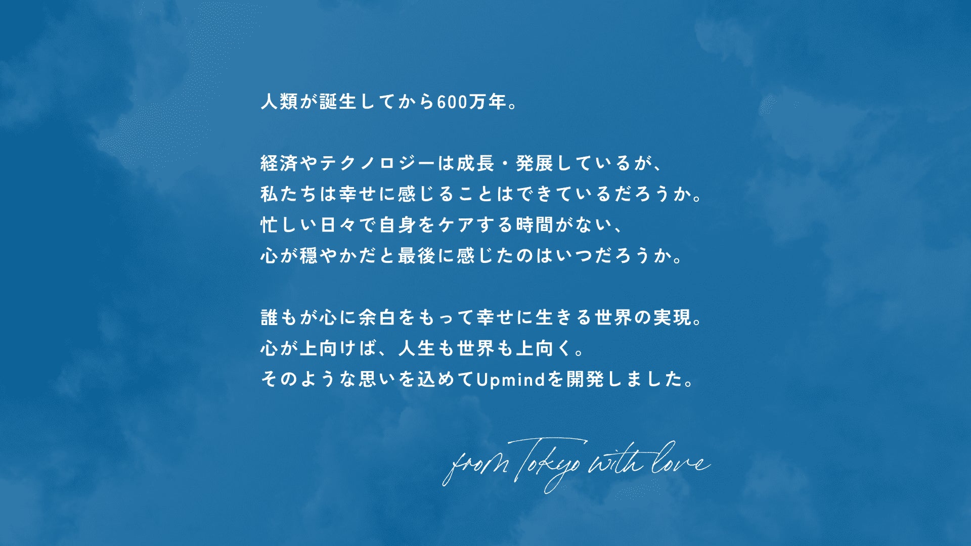 Upmind株式会社は、2021年5月に設立したウェルビーイングテックカンパニー。主に、国内発で最大のマインドフルネスアプリ「Upmind」を開発・運営(東京大学滝沢龍研究室とも共同研究)。心に余白をもつことの習慣化を支援するための事業を企画しています。