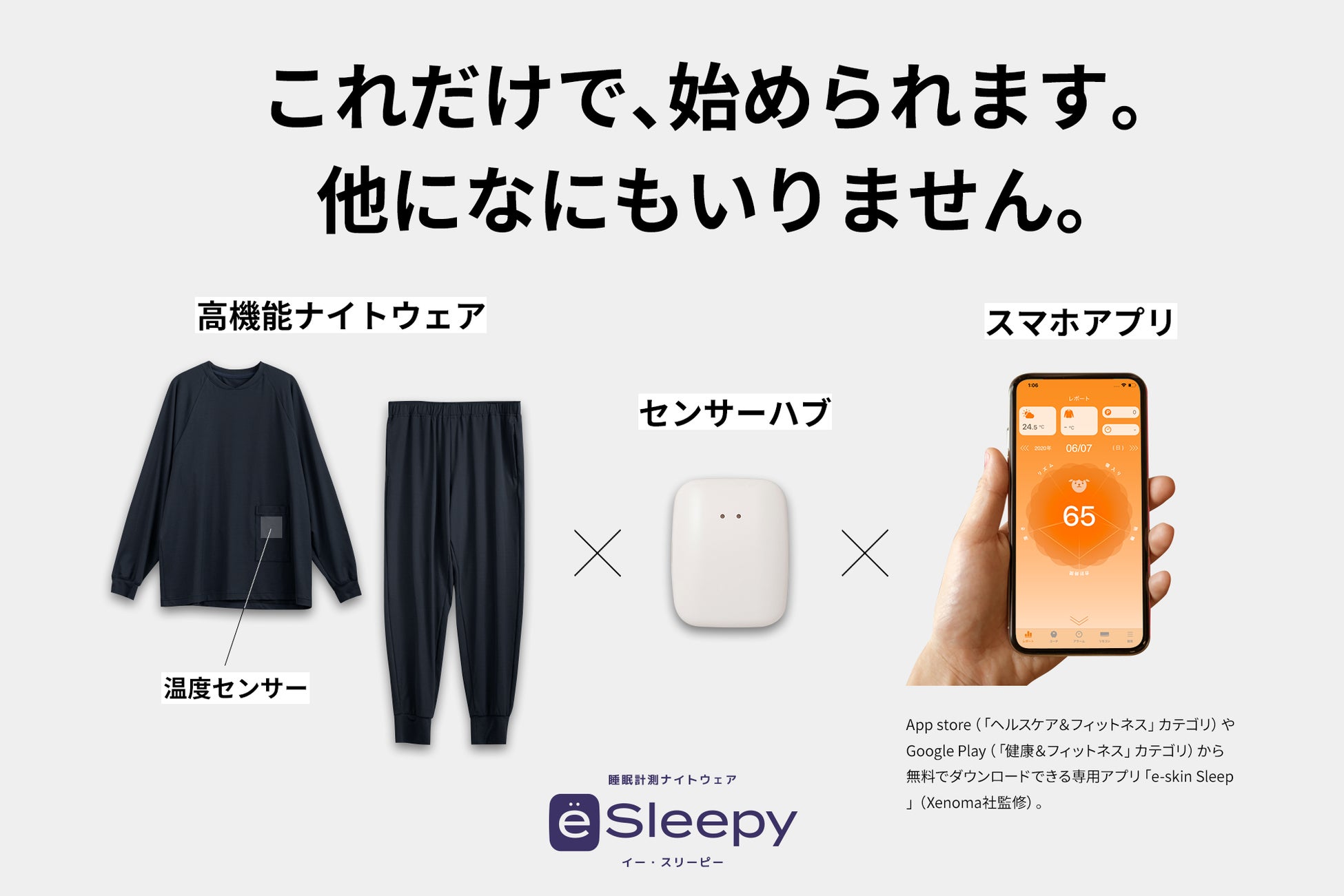 eSleepyは、「温度センサー付きナイトウエア」×「着脱式センサーハブ」×「専用スマートフォンアプリ※1」が一体となったプロダクトサービス(アプリによる睡眠の時間の可視化~プロ視点による睡眠向上アドバイスまで)です。