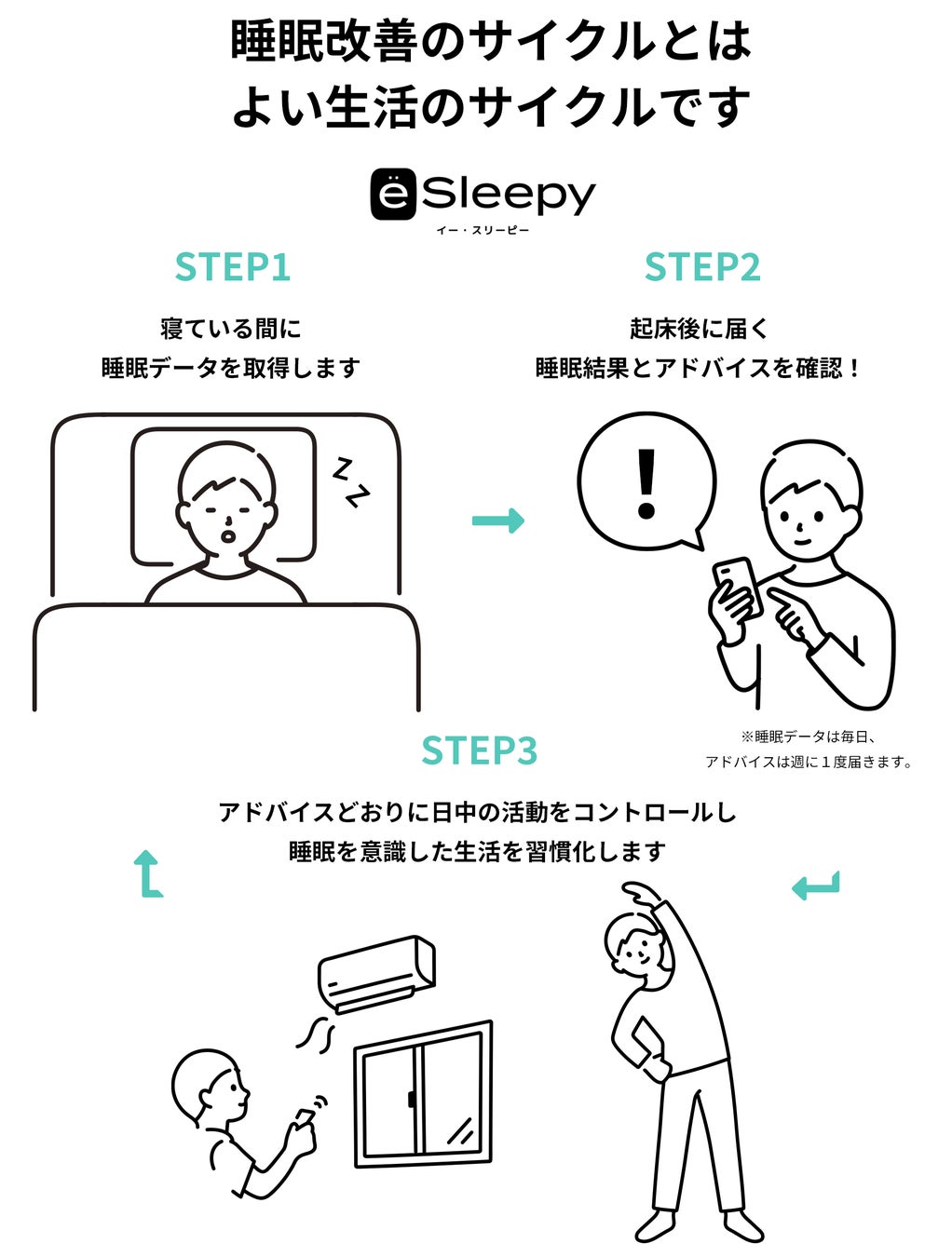 eSleepyのナイトウェアを購入すると、寝ている間の睡眠データの計測から睡眠改善のアドバイス※2を取得することができます。ビジネスパーソンの睡眠環境向上の豊富な実績を持ち、これまで大企業を中心に約100社、10,000人以上の睡眠改善をしてきたスリープテック企業「株式会社ニューロスペース」が協力しています。