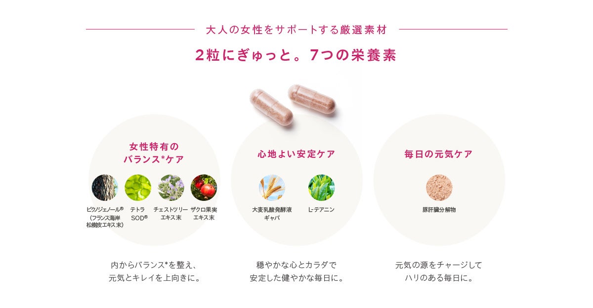 更年期世代の女性の、健やかで幸福感のある毎日のために、 厳選した7種の栄養素を、小さな2つのカプセルに凝縮しました。