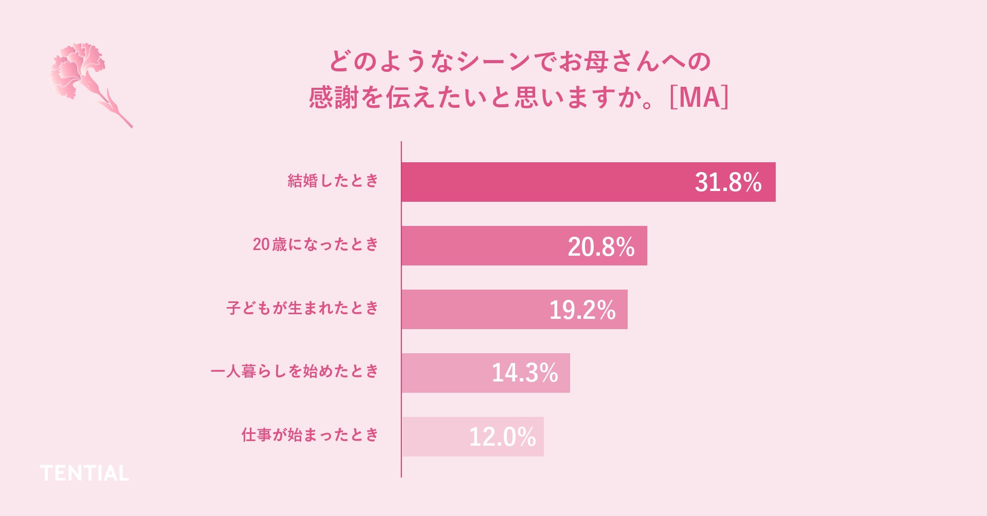 女性が母親に感謝を伝えたいシーンは結婚した時が最も高く、31.8%でした。また、結婚1年以内の新婚者のうち80%が今年の母の日に母親にプレゼントを渡したいと思っており、結婚の節目に親への感謝をする方が多いこともわかりました。