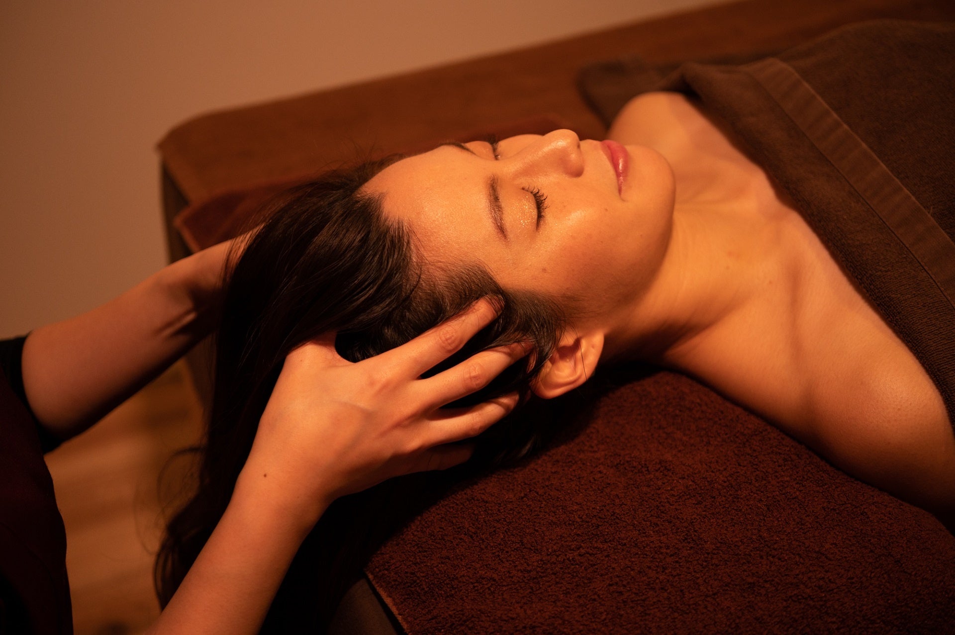 「快眠ヘッドセラピー」とは、睡眠に効く頭のツボを刺激し快眠に導くヘッドマッサージです。頭部を中心に、首や肩をゆっくりとほぐし、血行を促進しながらストレスや緊張を解消します。また、アロマオイルの香りや静かな音楽を組み合わせることで、深いリラックス状態を誘導し、質の高い睡眠を促進します。忙しい毎日で疲れた心身を癒し、心地よい眠りをサポートします。