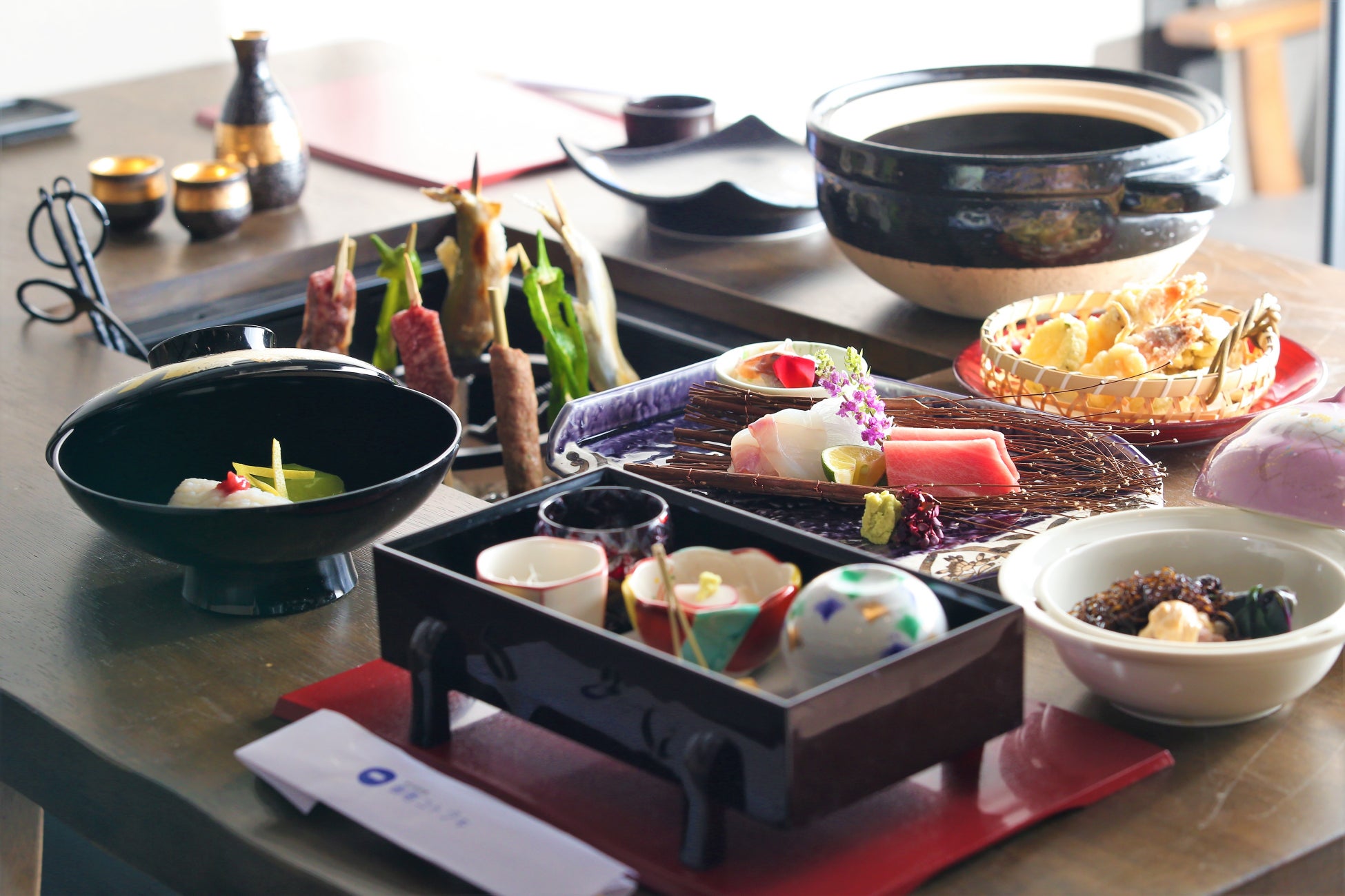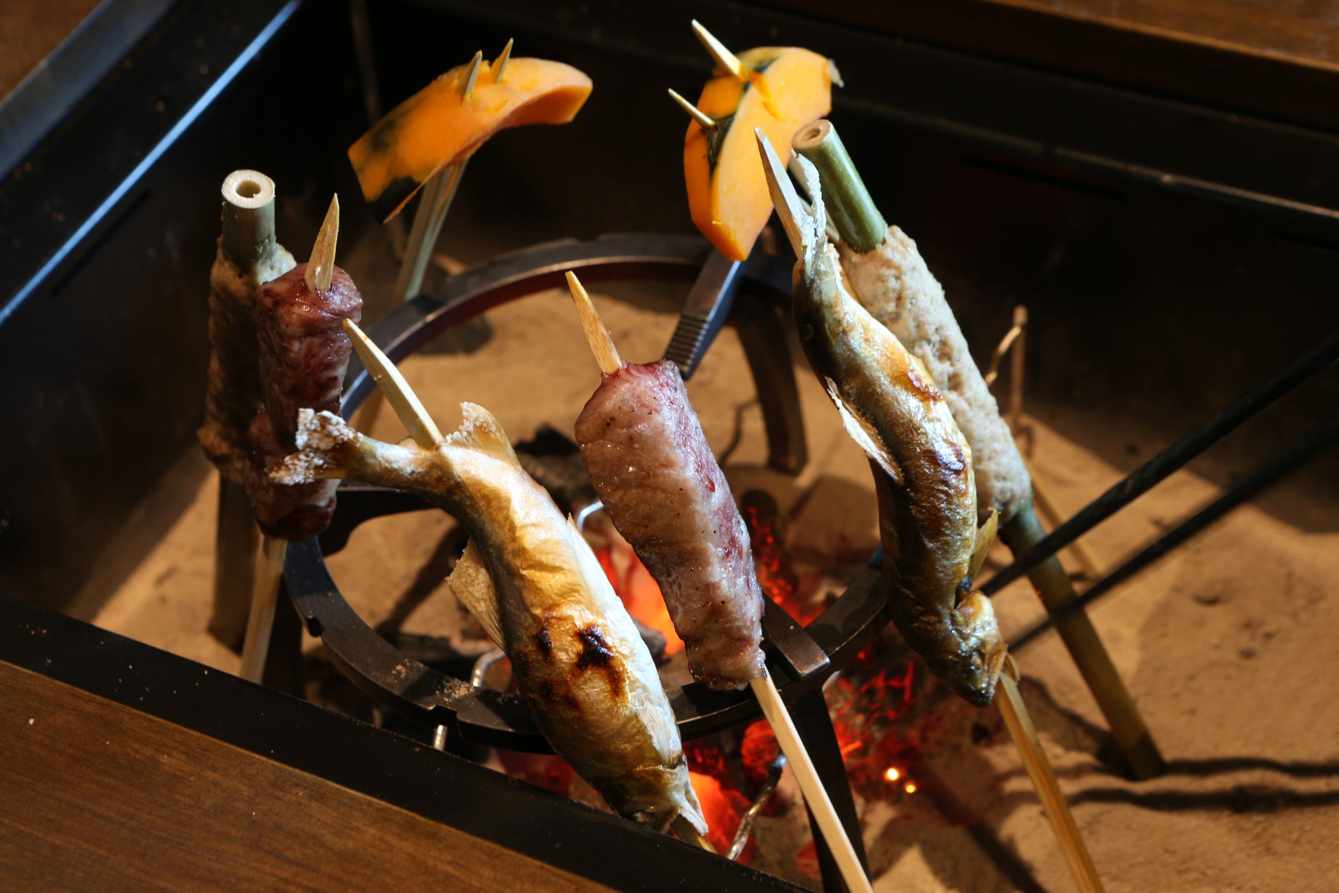 囲炉裏ダイニング「竃 KAMADO」でテーブルごとにある囲炉裏で炭火を使った焼き物を中心に満喫できるプラン。目の前の炭火を使いご自身で焼いて食べるお食事は見た目や音、そして香りでも存分に楽しめます。30分の快眠ヘッドセラピー付き。