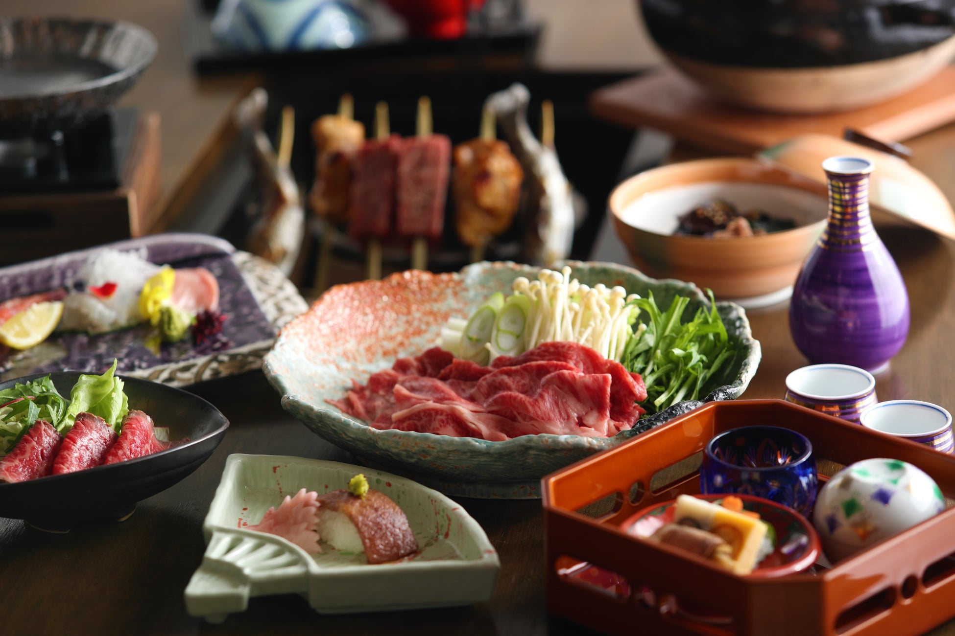 日本三大和牛の素牛で、和牛の中でも最高級とされる「但馬牛」を囲炉裏で串焼き、しゃぶしゃぶ等で楽しめる贅沢な会席で舌鼓。お腹も心も満足いただきつつ当館自慢の快眠ヘッドセラピーで身体も癒されます。