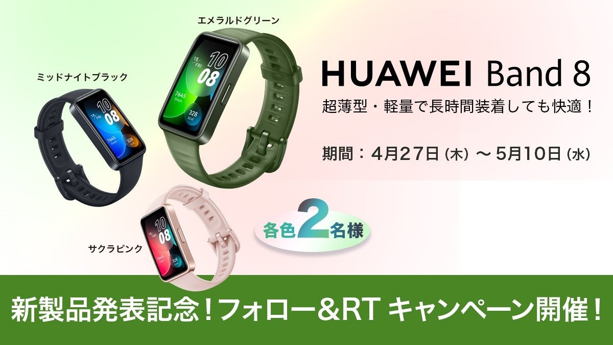 この度発表を記念し、本日4月27日(木)より、ファーウェイ公式Twitter(@HUAWEI_Japan_PR :https://twitter.com/huawei_japan_pr)で、『HUAWEI Band 8』 が当たるキャンペーンを行います。