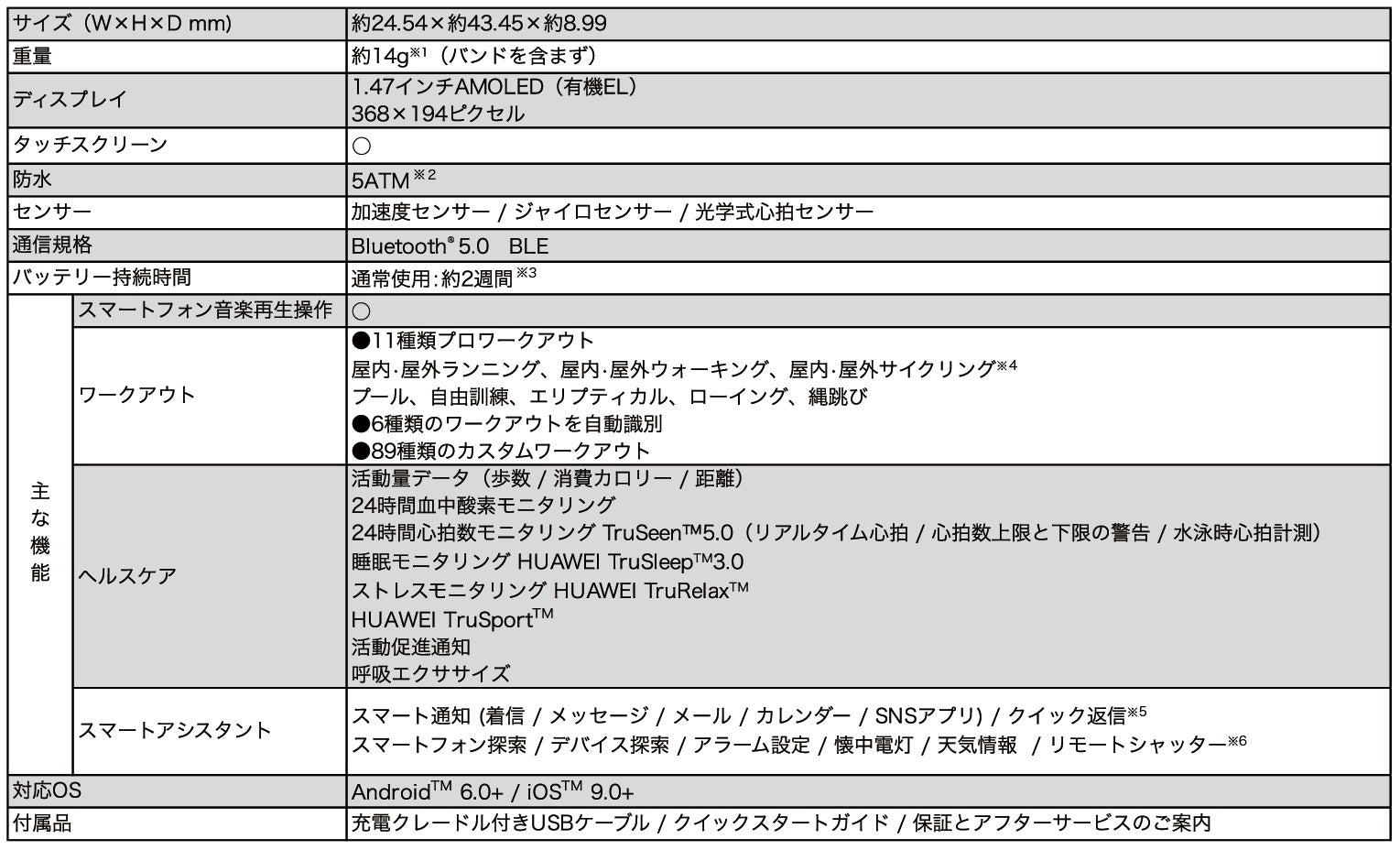※3:通常使用で約14日間とは、スマートウォッチをスマートフォンとペアリングし、心拍数モニタリングを有効化、毎週30分間ワークアウト、メッセージ通知を有効化(1日平均50メッセージ、電話6回、アラーム3回)、1日に200回画面点灯をした場合のファーウェイラボのテスト結果を参考にしています。