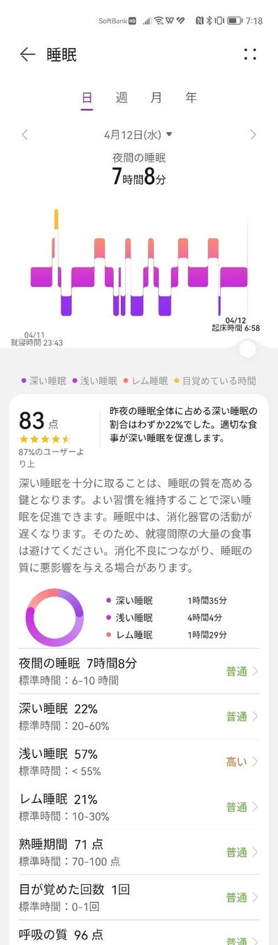 最新のHUAWEI TruSleepTM 3.0という独自アルゴリズムを搭載し、体の動き、心拍数、心拍変動と睡眠の関係をより深く掘り下げ、高精度の睡眠モニタリングデータを提供します。前モデル『HUAWEI Band 7』と比較し、モニタリング精度が約10%向上し、誤認識率が約40%減少しました※3。入眠・起床・睡眠状態における各データをより正確に測定でき、仮眠も見逃しません。また、「HUAWEI Health」アプリから詳細な睡眠データを見ることができ、いびきなどの睡眠時の音を録音・記録して睡眠分析に活かすこともできます。スマートウォッチを付け忘れた日は、手動で睡眠時間をアプリに追加することも可能で、長期的な睡眠データを把握するのに役立ちます。