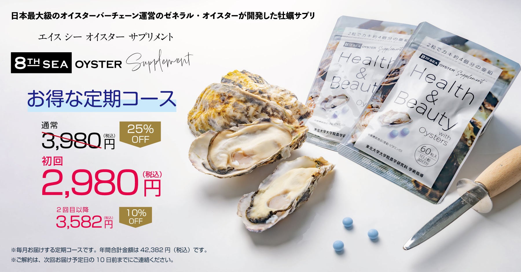 牡蠣の種苗生産・養殖、卸販売、オイスターバーの運営など牡蠣の6次産業化を展開する株式会社ゼネラル・オイスター(本社:東京都中央区、代表取締役社長:吉田秀則)は、東北大学 農学研究科農芸化学専攻の白川仁教授の学術指導により、牡蠣成分由来の栄養機能食品サプリメント『エイス シー オイスター サプリメント』を開発し、5月16日(火)より公式通販サイト「e-oyster(イーオイスター)」にて単品・サブスクリプションともに販売を開始いたします。https://e-oyster.jp/news/8thseasupple
