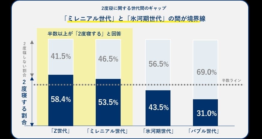世代別に見ると、2度寝以上する人の割合は世代が上がるとともに減り、Z世代とミレニアル世代は2度寝以上する人の方が半数を超えているのに対し、氷河期世代とバブル世代は2度寝をしない人の方が多く、2度寝有無の境界線が「ミレニアル世代」と「氷河期世代」の間にあることが判明しました。