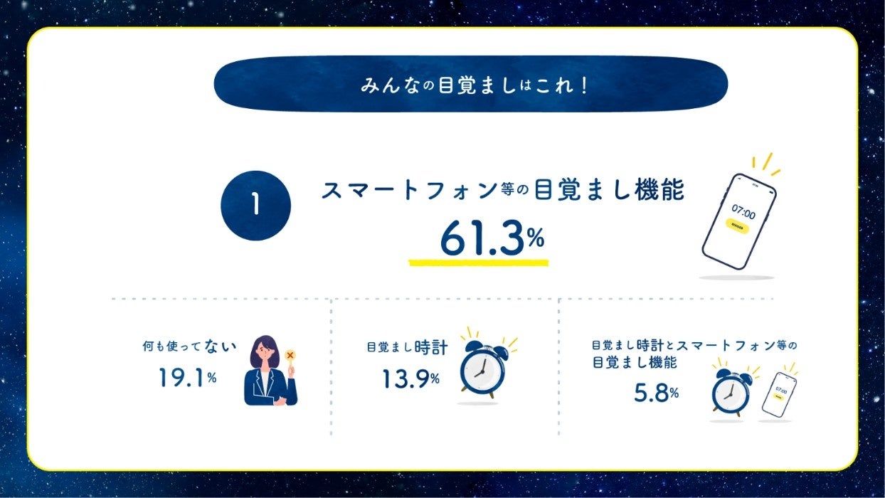 目覚ましアイテムは、「スマホの目覚まし機能」の使用が61.3%と最多。