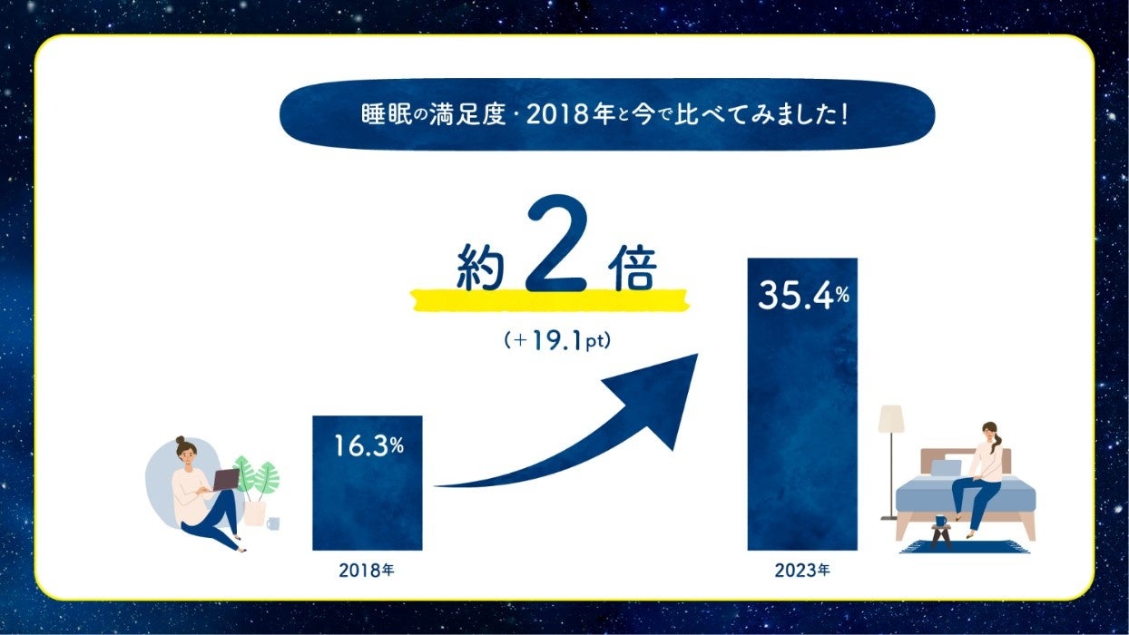 自身の睡眠に満足している人は35.4%。5年前と比べ19.1ポイント上昇。