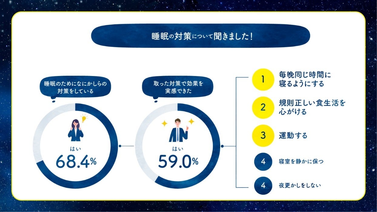 68.4%が良い睡眠のために対策を実施中。うち、59.0%が効果を実感していると回答。