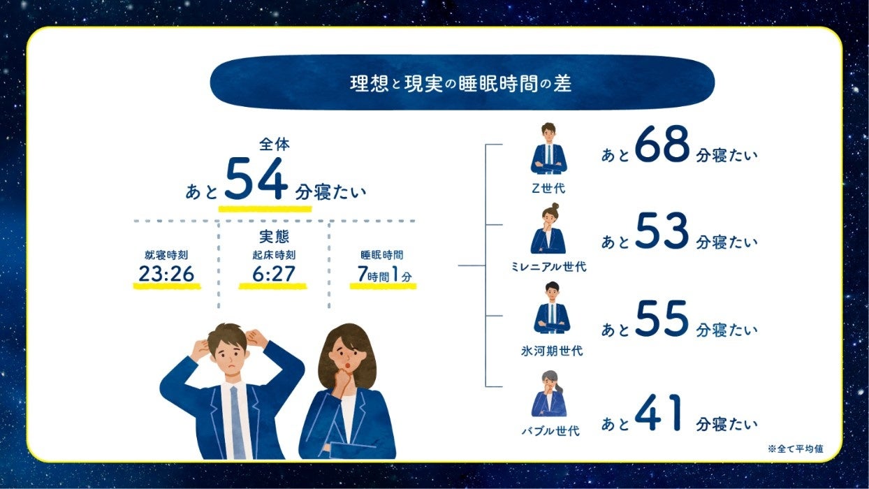 そのギャップはZ世代が最も大きく、理想と現実の睡眠時間差は1時間8分に。
