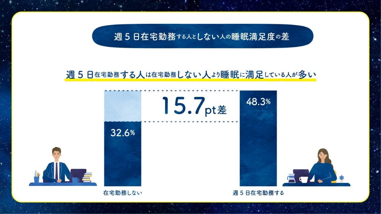 週5日リモートワーク(在宅勤務)をする人は、しない人と比べて睡眠満足度が15.7ポイント高いことが判明。
