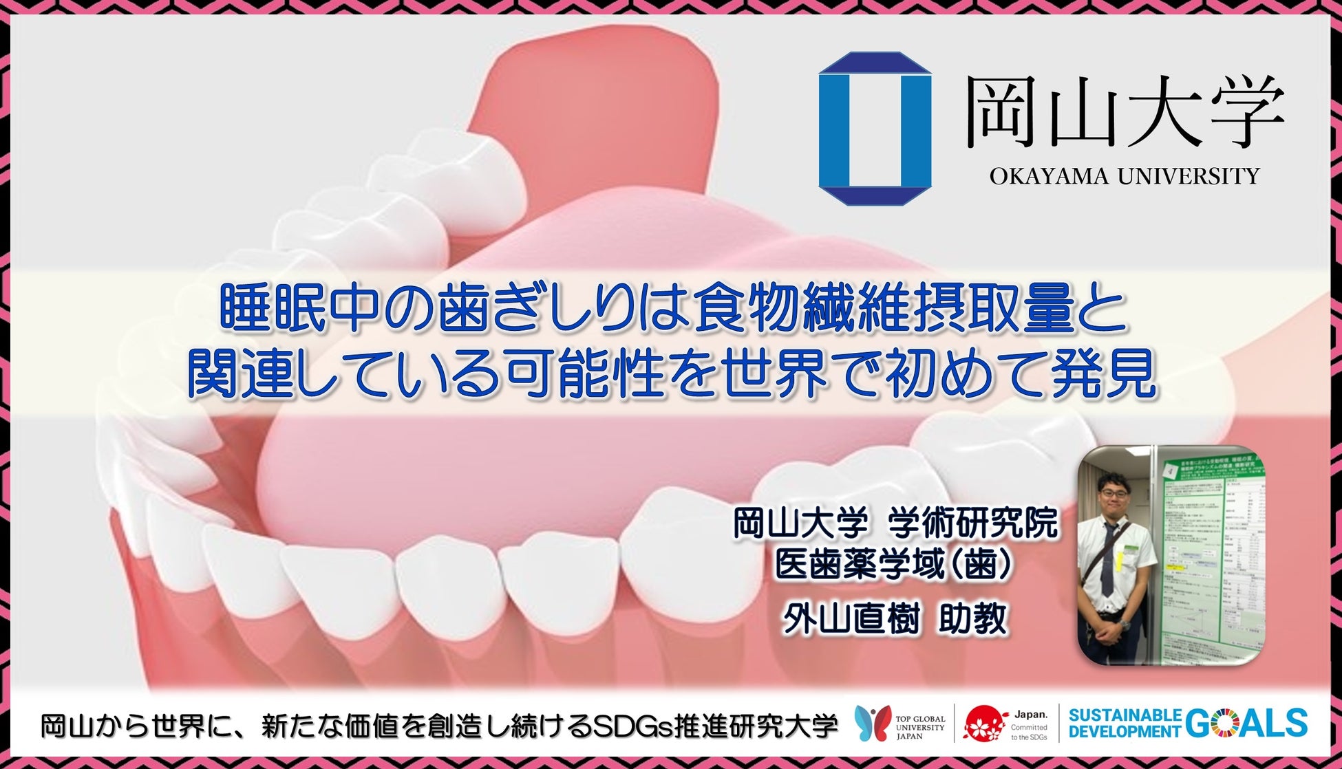 【岡山大学】睡眠中の歯ぎしりは食物繊維摂取量と関連している可能性を世界で初めて発見
