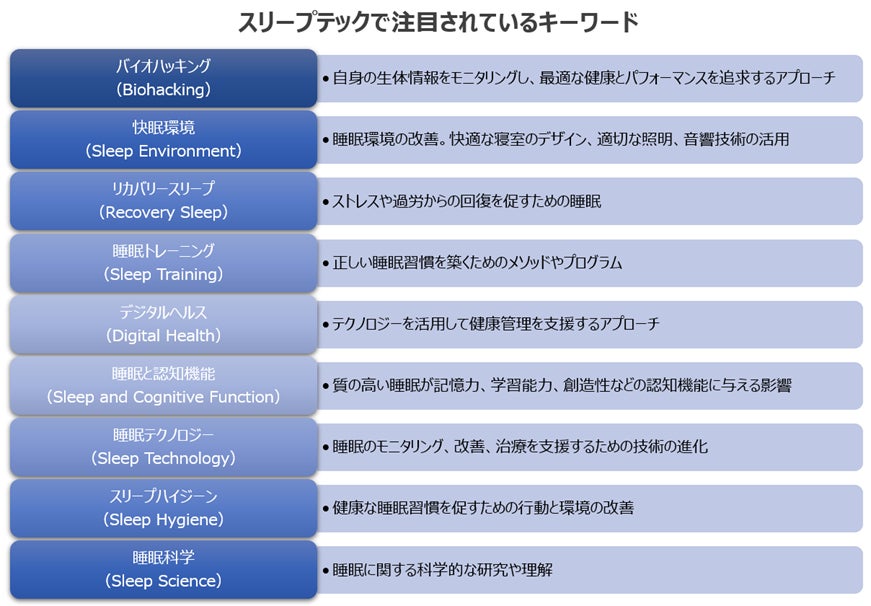 また、スリープテックにおいて注目されているキーワードには、バイオハッキング、快眠環境、リカバリースリープ、睡眠トレーニング、デジタルヘルス、睡眠と認知機能、睡眠テクノロジー、スリープハイジーン、睡眠科学などがあります。これらのトレンドは、睡眠のモニタリングやトラッキング、睡眠環境の改善、睡眠障害の診断と治療、睡眠トレーニングやリラクゼーション、パフォーマンス向上など、睡眠の質と量を向上させるための様々なアプローチを反映しています。スリープテックの進化と普及により、個人の睡眠状態の理解と改善が促進され、健康な睡眠習慣の確立に寄与しています。