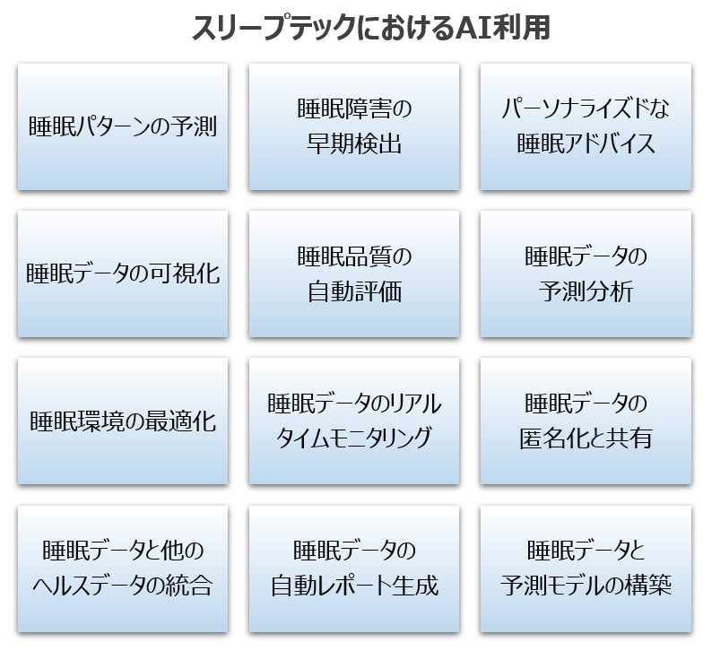 データプラットフォームの導入により、スリープテック業界ではAIの活用が進んでいます。これにより、睡眠データの収集・分析がより効率的に行われ、様々な領域で睡眠の理解と改善が促進されています。具体的には、睡眠パターンの予測や睡眠障害の早期検出、個別化された睡眠アドバイスの提供、睡眠データの可視化、睡眠品質の自動評価、睡眠データの予測分析など、AIを活用したさまざまな活動が展開されています。また、AIの活用により、睡眠研究の推進や睡眠データの共有、リモートモニタリングと遠隔診療の実現、機械学習と予測モデルの改善、ユーザーエクスペリエンスの向上、データセキュリティとプライバシー保護などにも大きな貢献が期待されています。これらの取り組みにより、睡眠の理解と健康への取り組みがより具体化され、個々のユーザーに合わせた睡眠改善のサポートができます。
