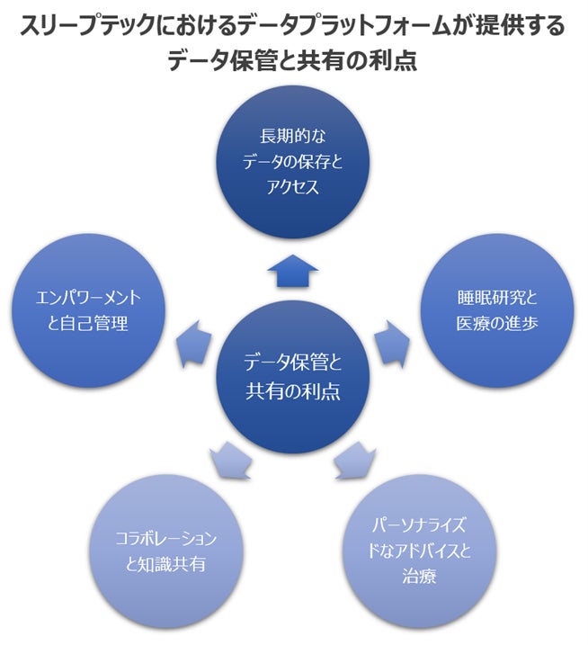 さらに、データプラットフォームによるデータの保管と共有は、パーソナライズドなアドバイスや治療の提供、コラボレーション、ユーザーのエンパワーメントと自己管理を可能にし、個々のユーザーの睡眠の質と健康への取り組みを支援します。データプラットフォームの導入により、睡眠データの効果的な利活用が実現され、よりパーソナライズドされた効果的な睡眠ケアを提供ができるようになります。