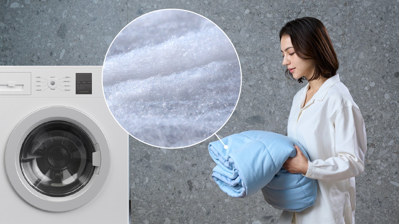 親水性のある中わたを使用しているため、布団の内部までしっかりと洗浄する事ができ、内部の汚れやダニの心配も不要です。