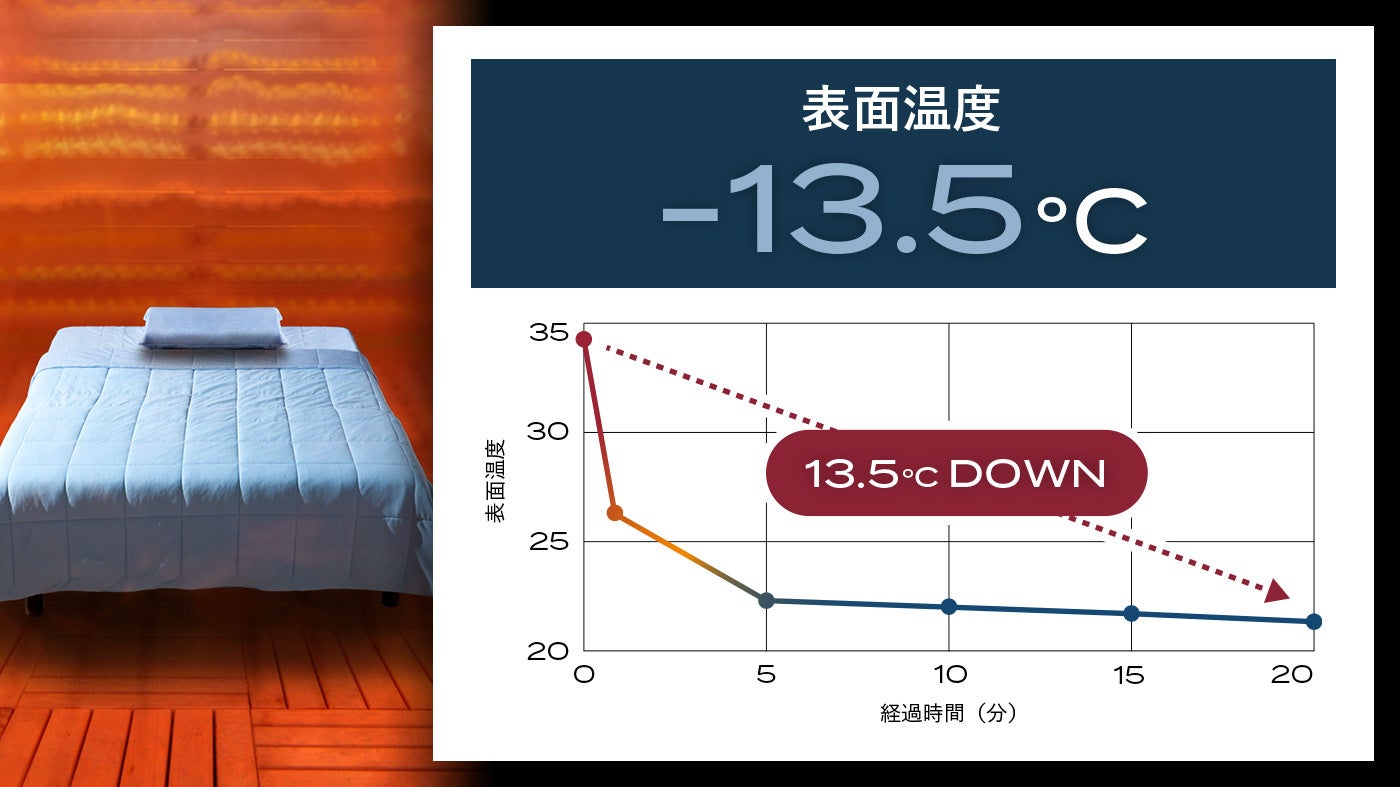 パーフェクト クールを掛けると34.4℃(猛暑日の外気温並)の体の表面温度が快適な約20.9℃に下がる結果が出ました。布団を掛けないよりも、掛けた方が冷たく快適な事が実証されました。