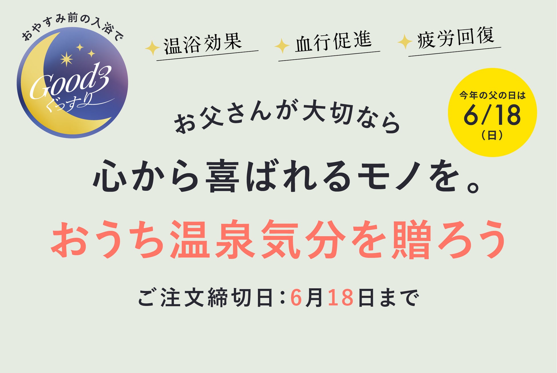 長湯ホットタブによる”おうち温泉”では、弊社がかかげる”お休み前の入浴でGood3(ぐっすりー)”
