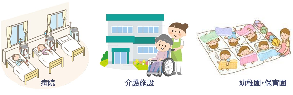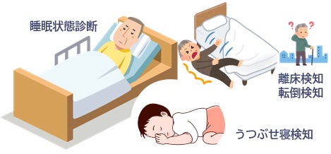 幼稚園・保育園では、お昼寝の見守り、病院・介護施設では、睡眠見守りの他、転倒検知、離床検知を追加して行うことができます。