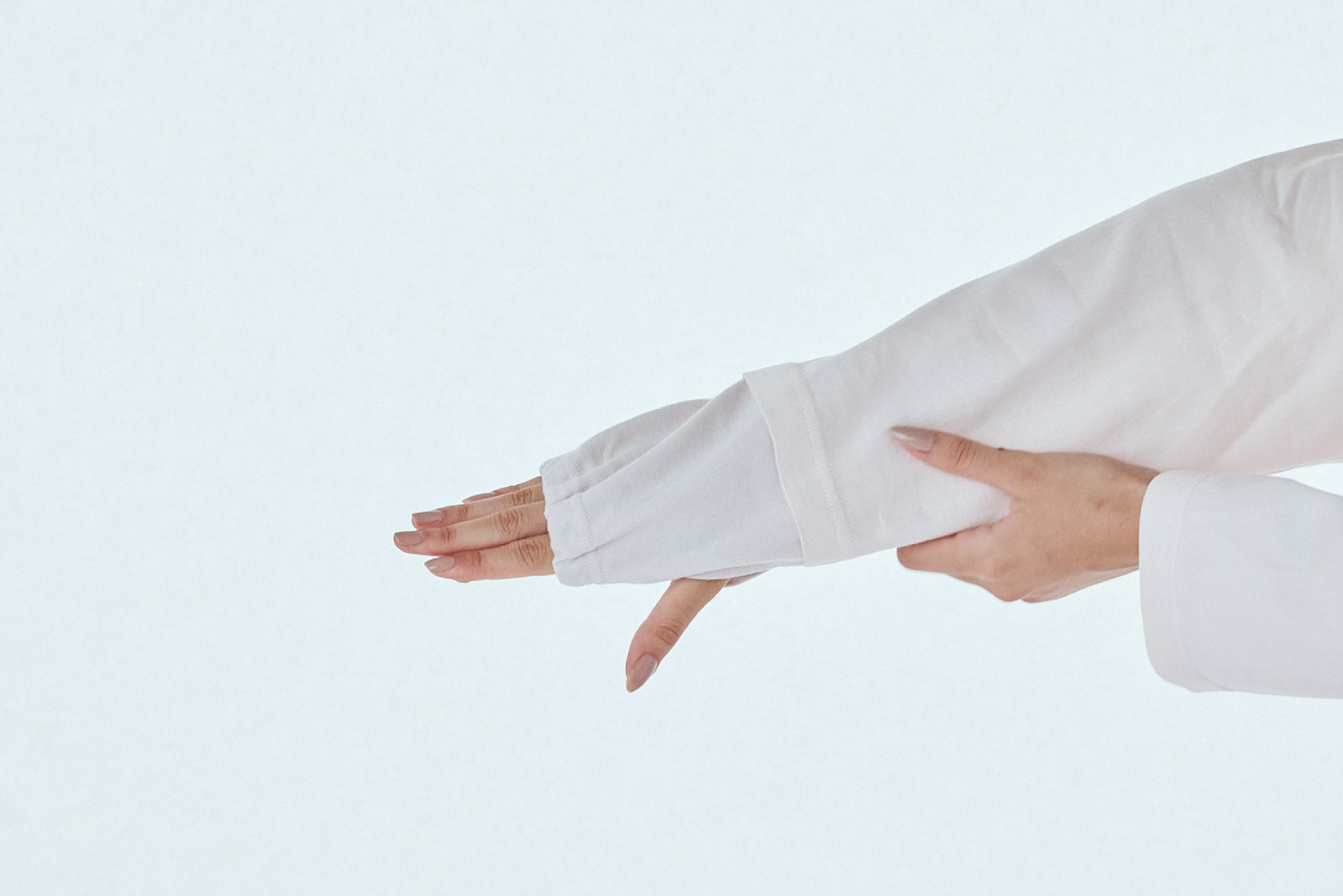 手首足首部分は2重構造になっているため、外に伸ばして使用すると、手の甲やかかとまでしっかり保湿することができます。また、内側に織り込んでしようすることで、手首・足首を温めることもできます。