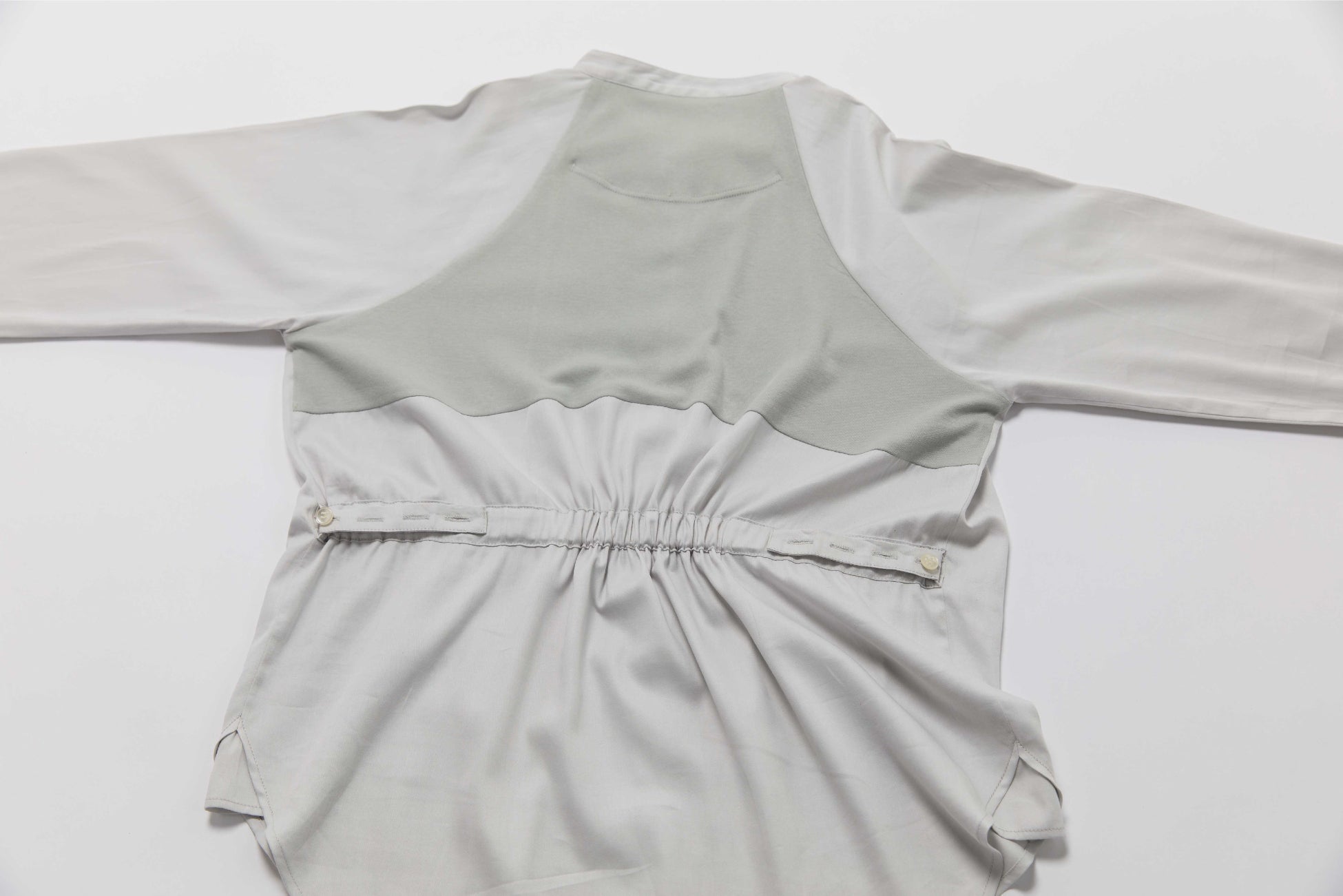 背面の腰部分にアジャスターを採用しています。アジャスターをしめて、パジャマを心地よく体にフィットさせることで、寝返り時などにパジャマがめくれ上がることを防ぎます。アジャスターは背面のみにあるので、きっちり締めても前からの見た目は変わりません。