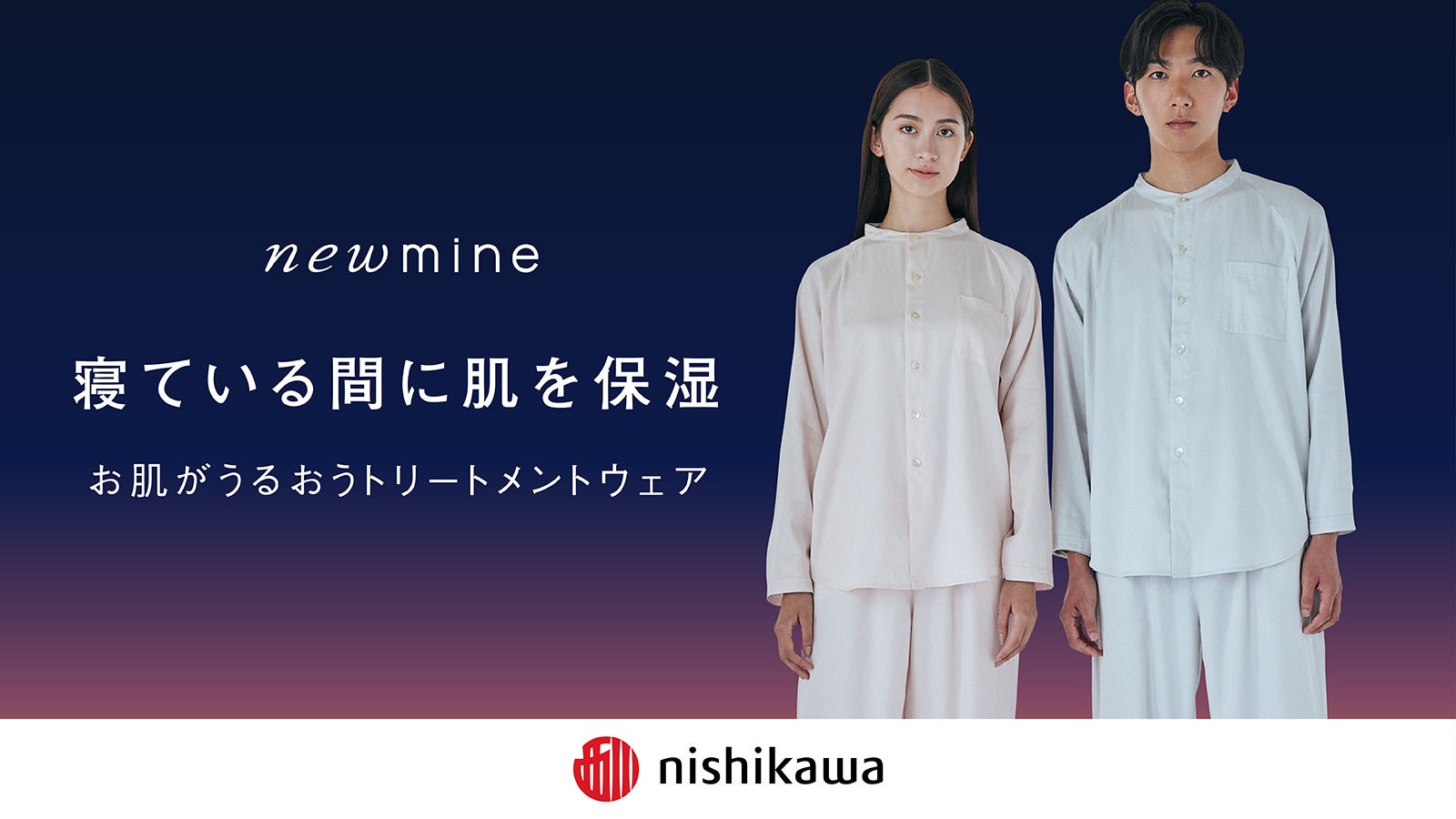 「newmine」 が次に着目したのは、最も肌に近い寝具「パジャマ」です。約2年の開発期間を経て、 『トリートメントウェア』が完成しました。繊維にビタミンE(※2)が練り込まれた生地を採用。体温や摩擦に反応して放出されるビタミンE(※2)が肌(角質層まで)に浸透します。この保湿効果は、布製品でありながら医薬品医療機器等法による化粧品として届出がなされています。また、長年睡眠を科学してきた西川ならではの、快適な眠りをサポートする多様な機能も満載です。睡眠時の首元への負担を軽減するパッド「4Cネック」、伸縮性の高い生地で動きやすさをつくる「X-Back」、めくれ対策の「腰上アジャスター」、手の甲やかかとまでしっかり保湿ができるように伸ばして使用できる手首足首部分の2重構造など、こだわりの機能を搭載しています。ユニセックスで、S・M・Lの3サイズを展開します。
