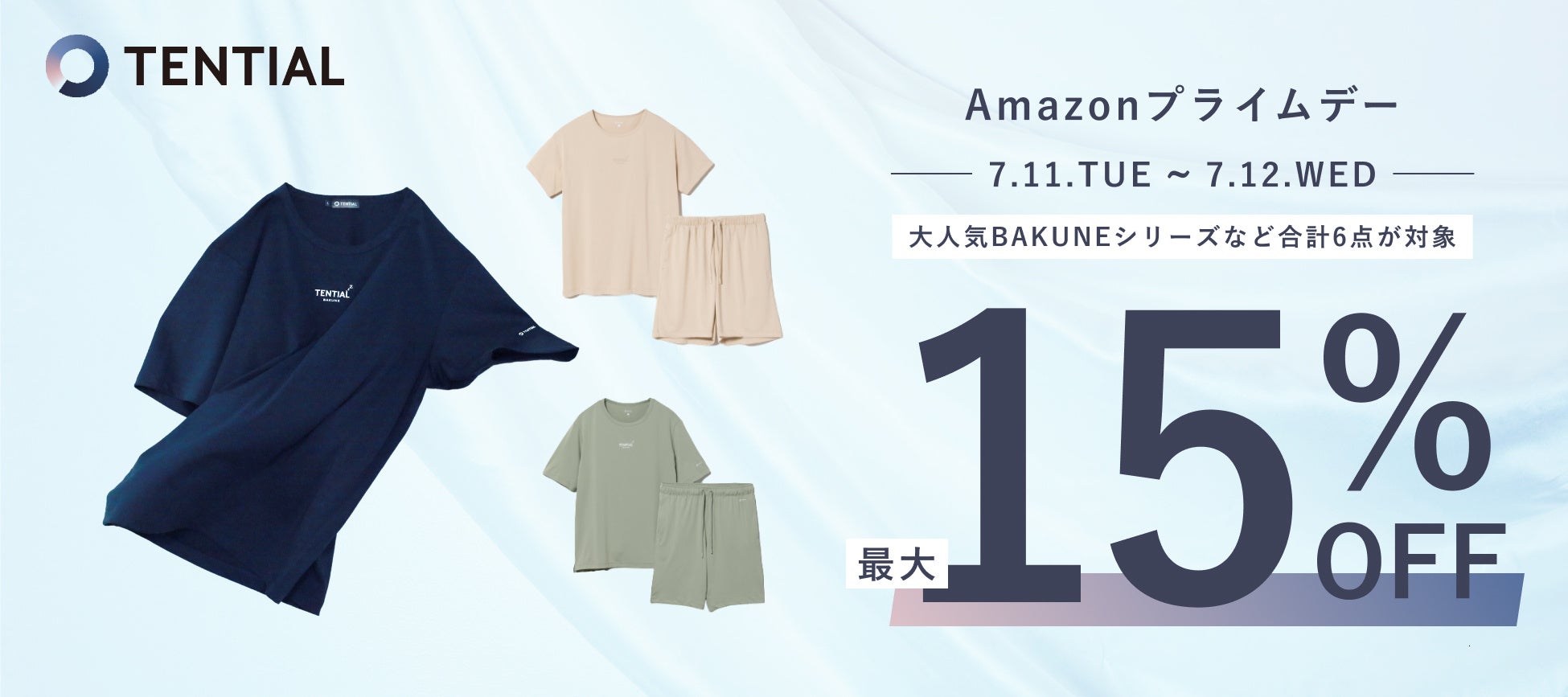 2023年7月11日(火)00:00から7月12日(水)23:59まで合計48時間にわたり、Amazonが開催する「プライムデー」において、人気のリカバリーウェア「BAKUNE」シリーズをはじめとしたTENTIALのリカバリーウェアを最大15%OFFにて販売します。