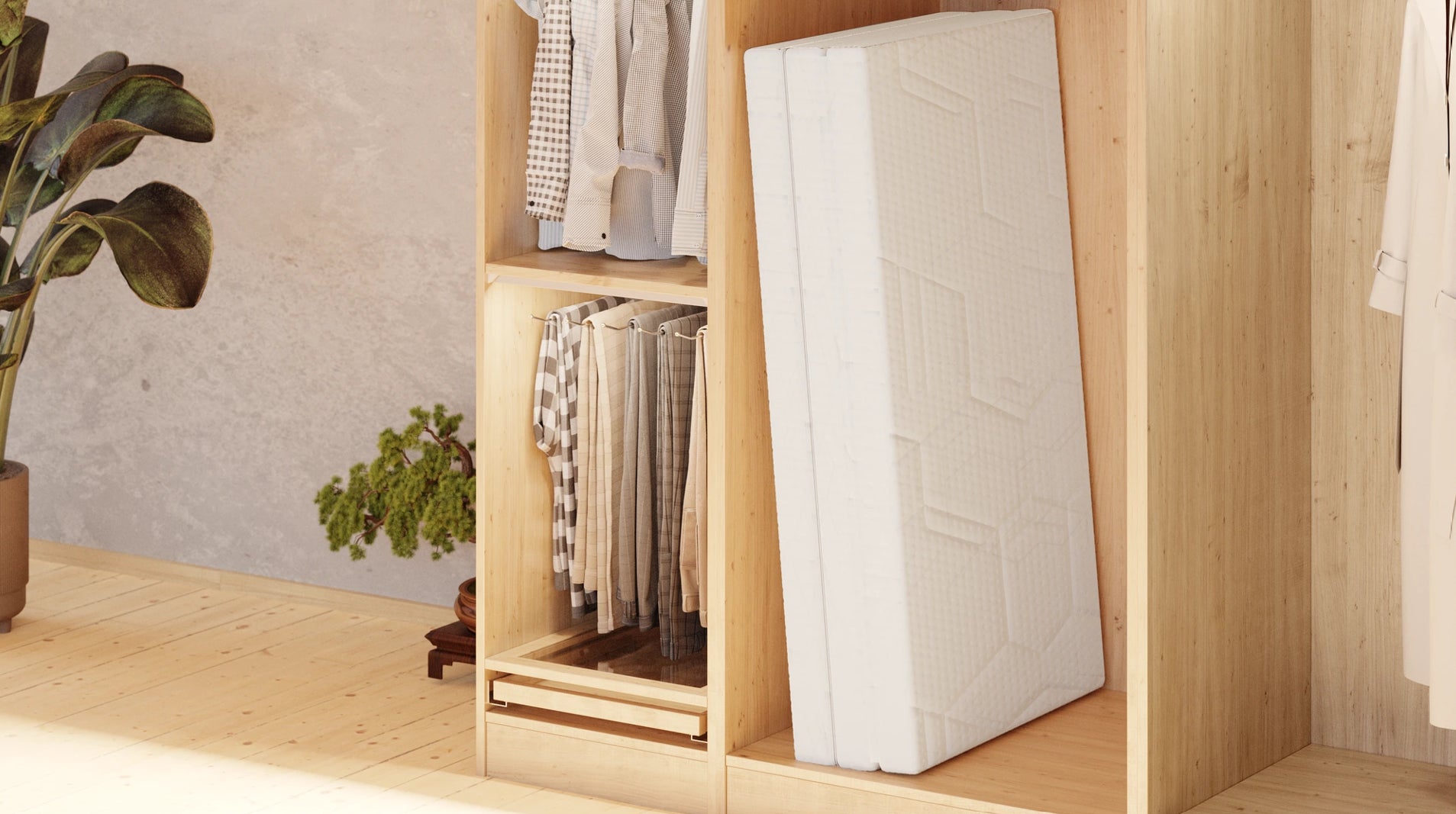簡単に折りたためて、ご自身の使い方に合わせて、押入れやお部屋の片隅に移動できる三つ折りデザイン。お部屋のスペースを有効的に使いつつ、睡眠の質もアップグレードできます。これ一台で自立するので、定期的な湿気対策も簡単に続けられます。