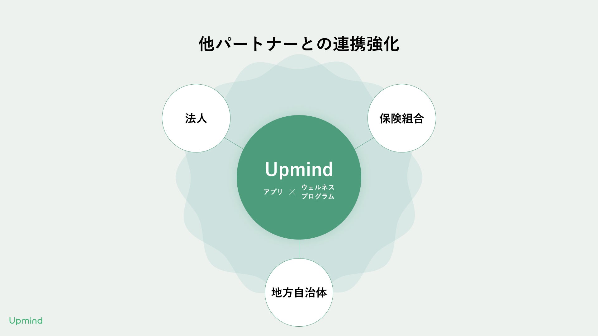 これまでUpmindが注力してきた、ユーザーに最も近いデジタル接点となり得るヘルスケアアプリの開発、メンタルヘルス・ウェルビーイングを実現する手段として近年着目されているマインドフルネスでの行動変容、の知見を活かして、今後は、予防医療(メンタルヘルス含む)を革新する企業として、健康経営に取り組む企業や保険組合を対象とした、法人事業を本格的に強化していきます。