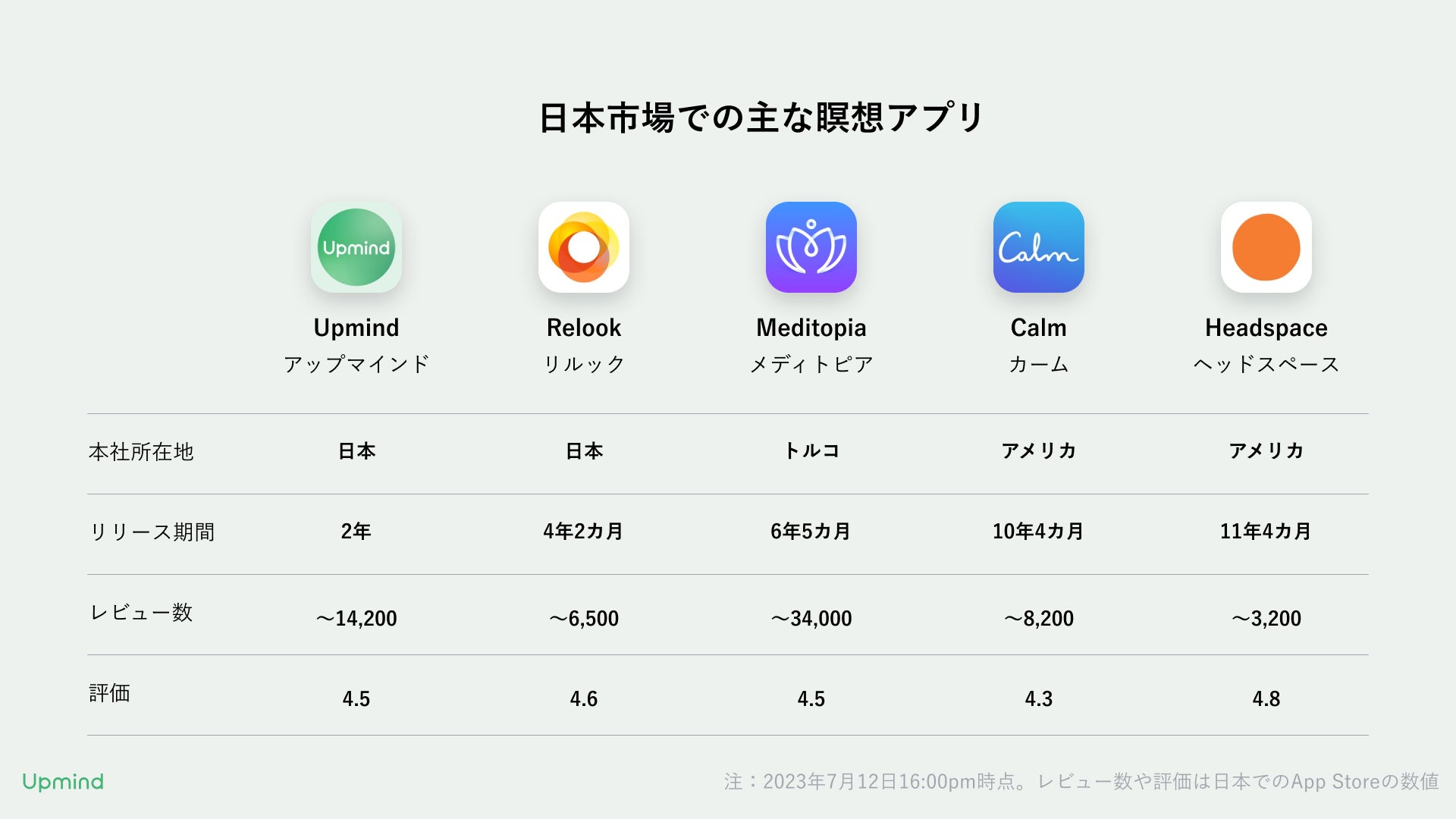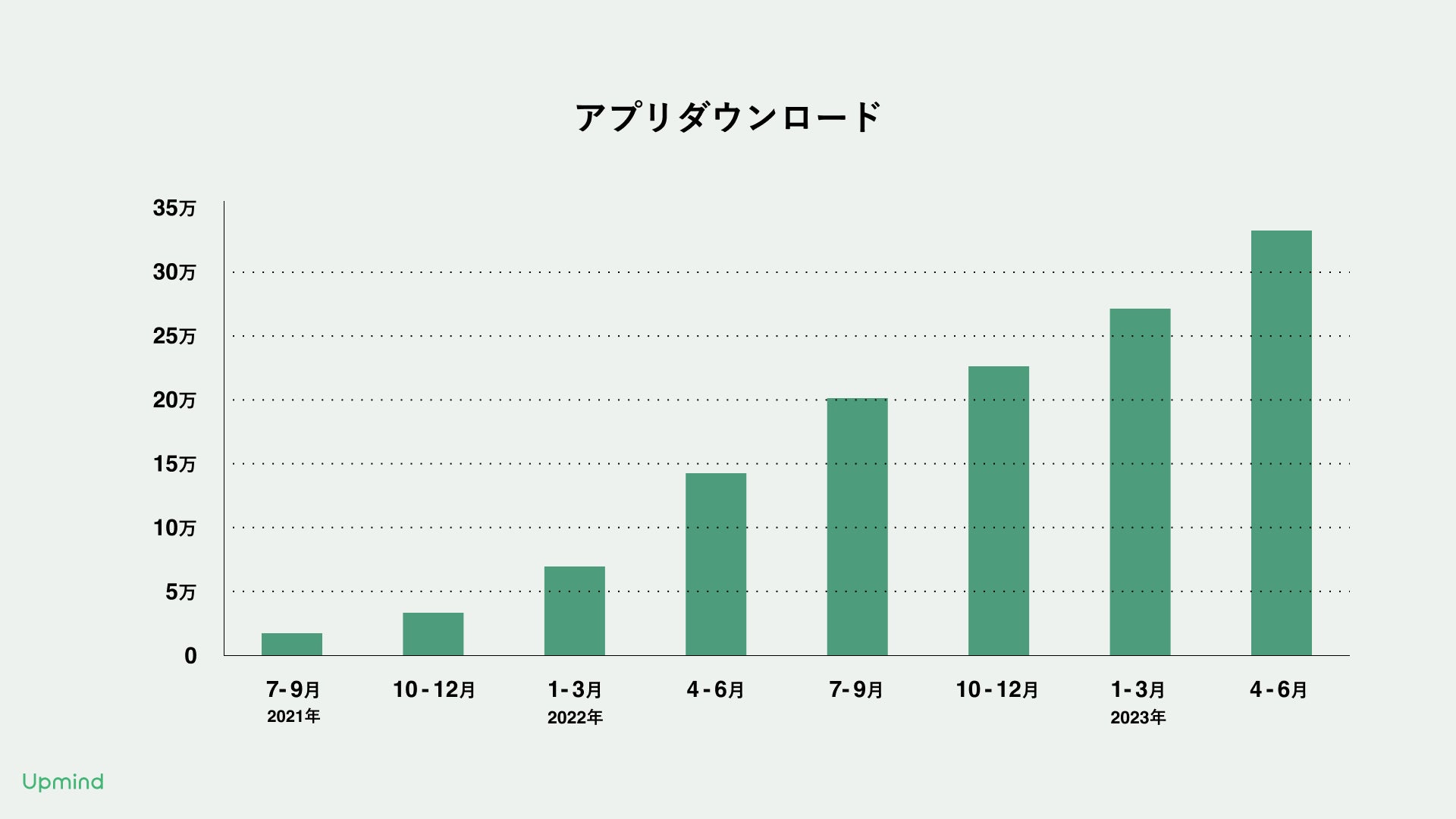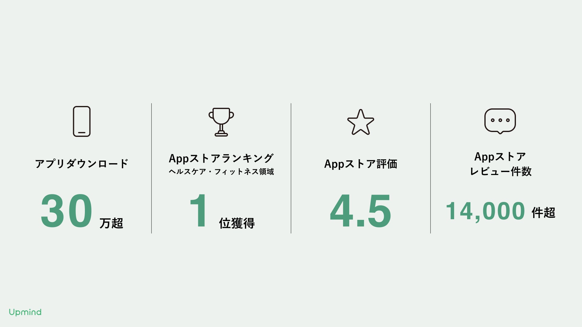 Upmindは、リリース後からダウンロードを着々と伸ばし、”日本発のマインドフルネスアプリ”としてダウンロード・レビュー数NO.1まで成長してきました。2023年5月4日には、国内発のマインドフルネスアプリとしてはじめて、AppStoreランキングのヘルスケア/フィットネス領域で1位も獲得。今後も多くの方にご利用いただき、メンタルヘルス・ウェルビーイングを普及するサービスとして成長を図って参ります。