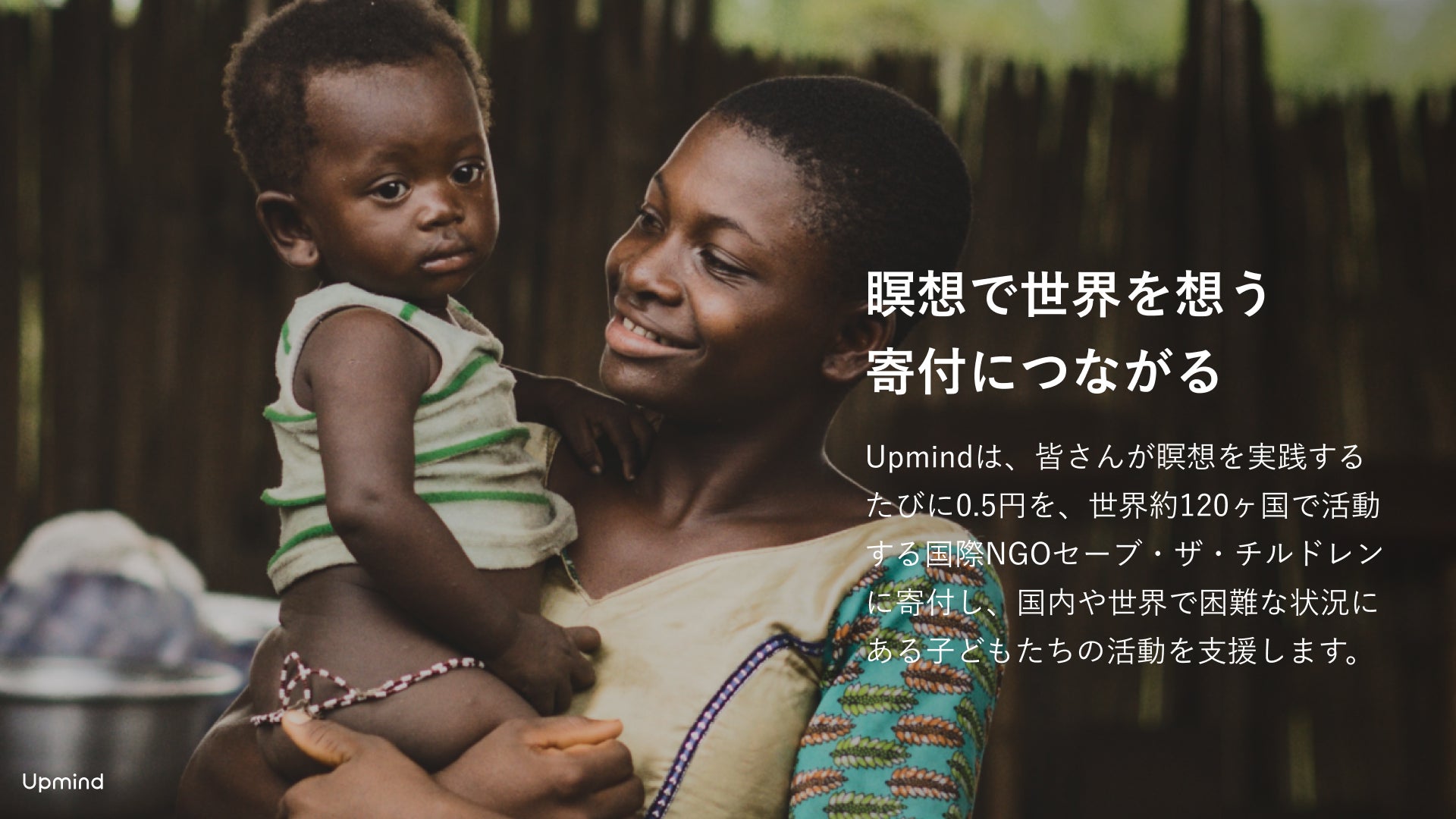2022年11月に、Upmindアプリでユーザーの方が瞑想をするたびに、0.5円が世界約120ヶ国で活動する国際NGOセーブ・ザ・チルドレンに寄付され、国内や世界で困難な状況にある子どもたちの支援のための活動を支える取り組みを開始しました。メディテーションを通して、国境・人種・宗教を超えて、お互いを思い合える優しい世界になれば良いなと心の底から願い、活動を継続しています。