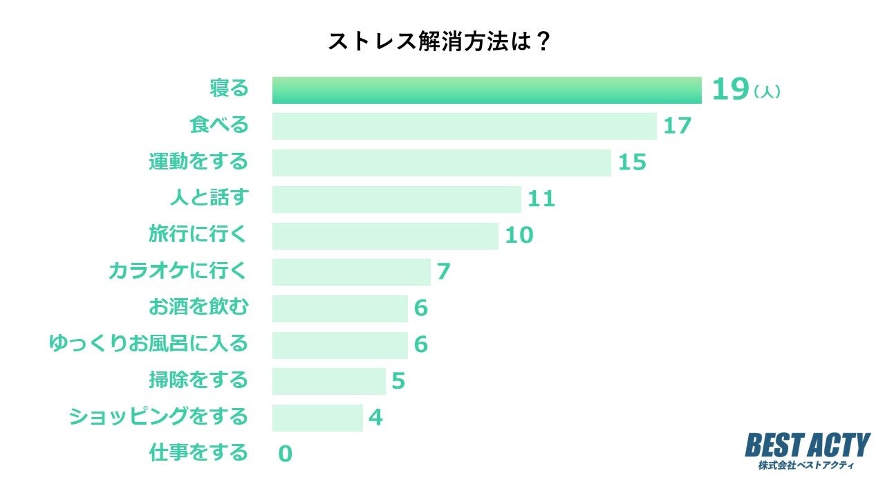 ストレスの解消方法について100人にアンケートを行ったところ、「寝る」と回答する人が最も多い結果となりました。