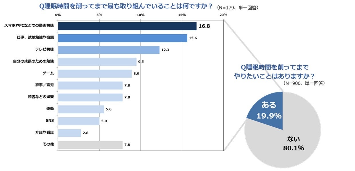 睡眠時間を削ってまでやりたいことがあるかを聞くと、5人に1人があると回答。あると回答した人に最も睡眠時間を削っている内容を聞くと、1位が「スマホやPCなどでの動画視聴」で16.8%、2位が「仕事・勉強」で15.6%、3位が「テレビ」で12.3%という結果となり、さらに約7割の人が週5日以上の頻度で睡眠時間を削っていると回答しました。