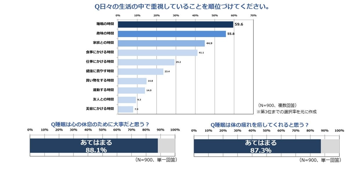 日々の生活の中で重要視していることを聞くと、1位が「睡眠の時間」で59.6%、2位が「趣味の時間」で55.8%、3位が「家族との時間」44.9%という結果になりました。さらに、約9割の人が睡眠は心身を癒すためにも大事なことだと考えていることがわかりました。