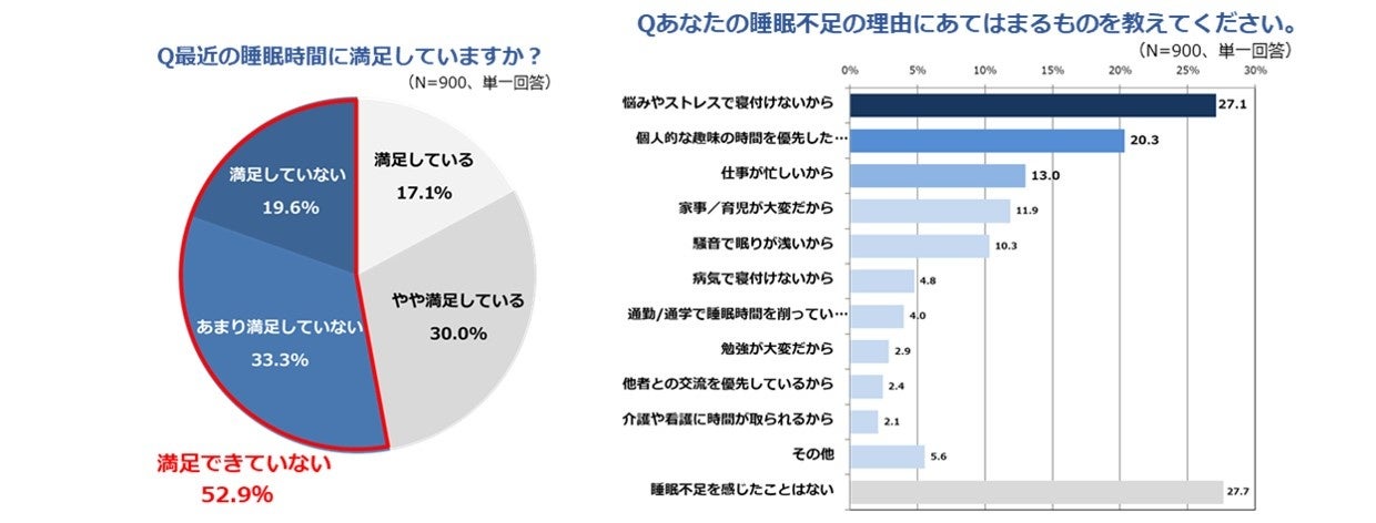 また、最近の睡眠時間に満足しているかという設問には、「満足していない」が19.6%、「あまり満足していない」が33.3%で約半数の52.9%の人が最近の平均睡眠時間に満足できていないと回答。また睡眠不足の理由の1位が「悩みやストレスで寝付けない」で27.1%、2位が「個人的な趣味の時間を優先したい」で20.3%、3位が「仕事が忙しい」13.0%という結果になりました。