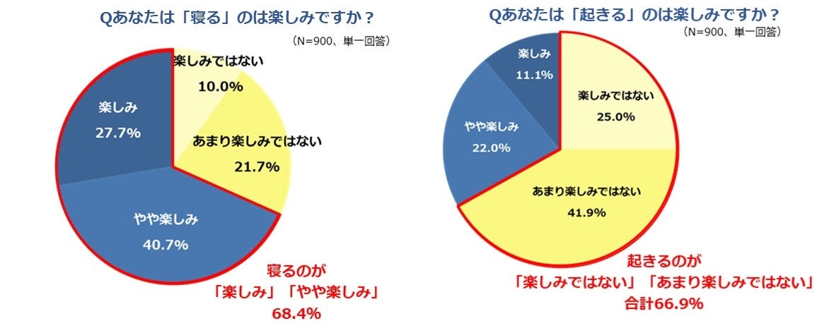 寝るのが楽しみかを聞くと、約7割が「楽しみ」と回答。その内約8割の人が「寝ること自体が好き」と回答しました。一方、起きるのが楽しみかを聞くと、約7割が「楽しみでない」という逆の結果となりました。寝ることへ楽しみな思いが強い反面、眠りが覚め、起きることへの楽しみがないことがわかりました。
