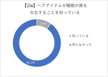 睡眠の質と髪の香りの関連性が明らかになっているなか、「睡眠の質を上げる方法として、ヘアケアアイテム(シャンプー、トリートメン ト、ヘアオイルなど)が睡眠の質を左右することを知っている」と答えた人の割合は1割以下(9.1%)にとどまりました[図6]。手軽に睡眠の質を改善する方法として毎日のヘアケアを意識する人はまだ少ないことがわかります。