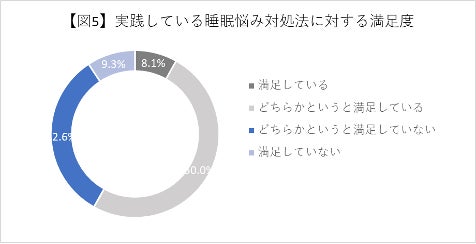 睡眠の悩みについての具体的な対処法として、「適度に運動をする」(36.1%)「お風呂にゆっくりつかる」(34.3%)「早めに就寝する」(32.5%)が上位に挙げられましたが、実践している対処法について満足していない人は42.9%(満足していない 9.3%+ どちらかというと満足していない32.6%)と、現在の対処法に十分満足できていない様子が伺えます[図5]。